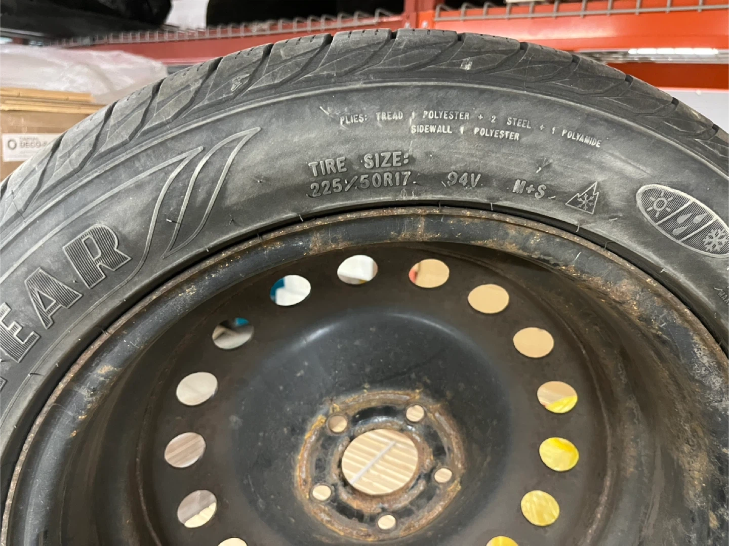 This is a Goodyear Assurance spare tire with a size of 225/50R17 94V. It's a full-size spare rim with a tire on it.