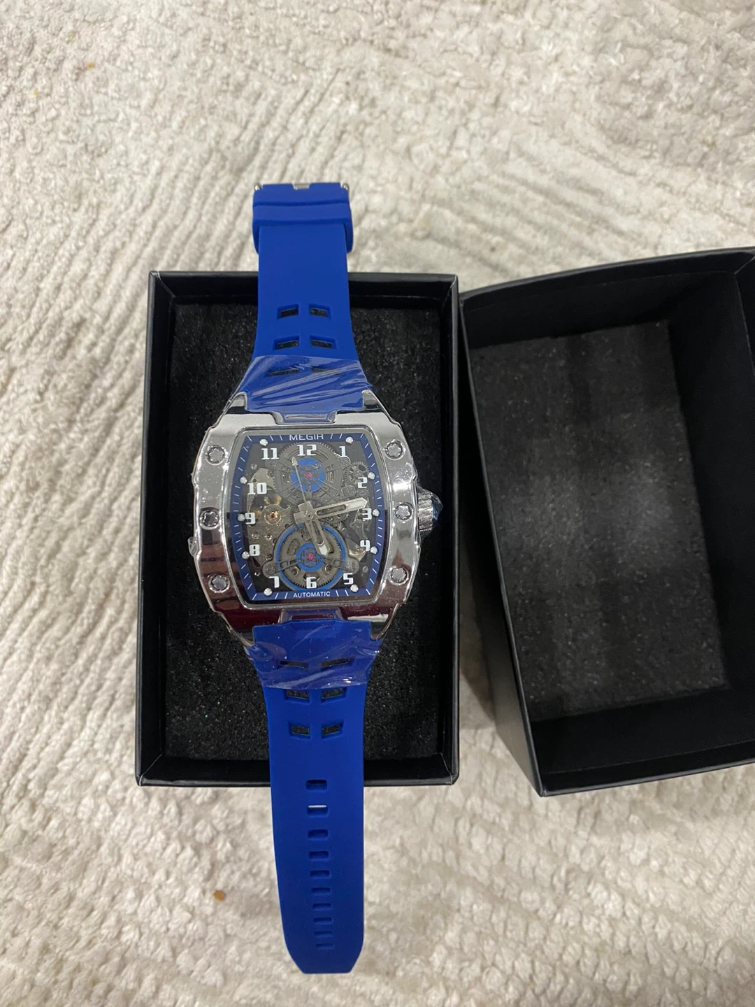 This MEGIR automatic watch features a silver-tone case with a blue silicone strap. It has a skeleton dial and is presented in its original box. This watch is automatic, meaning it winds itself with your movement.