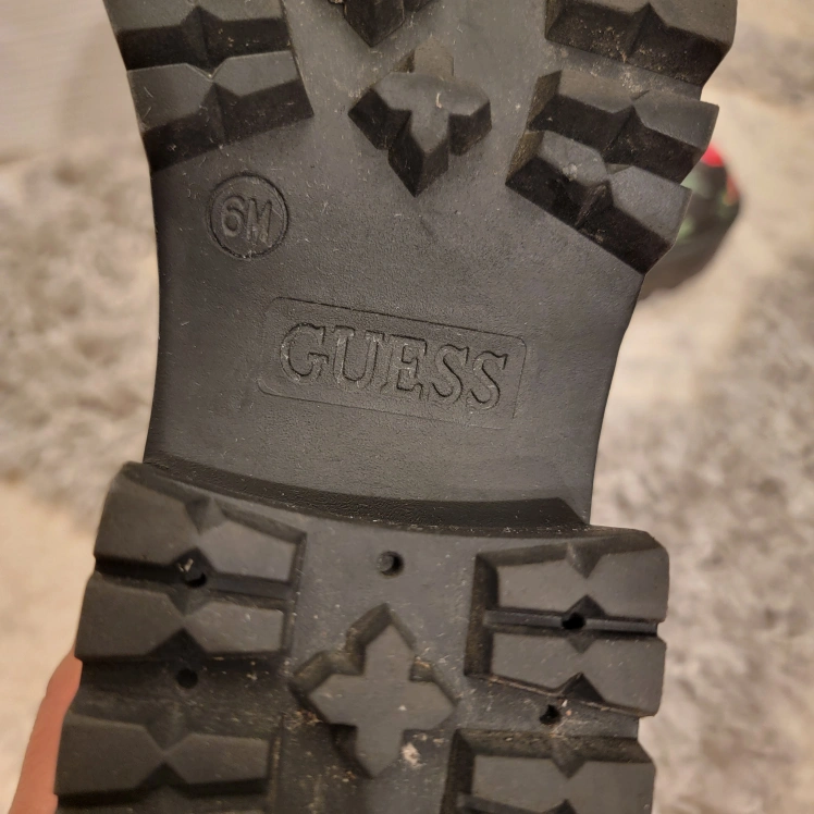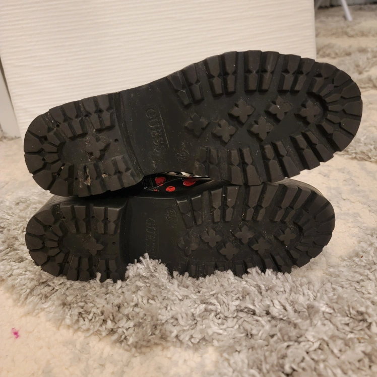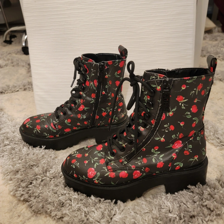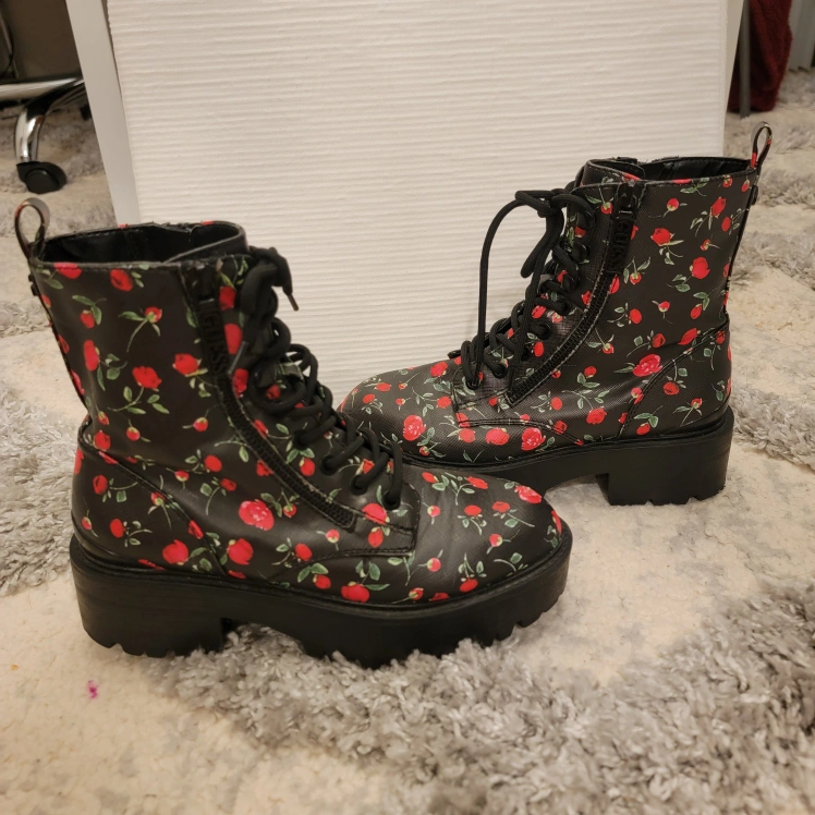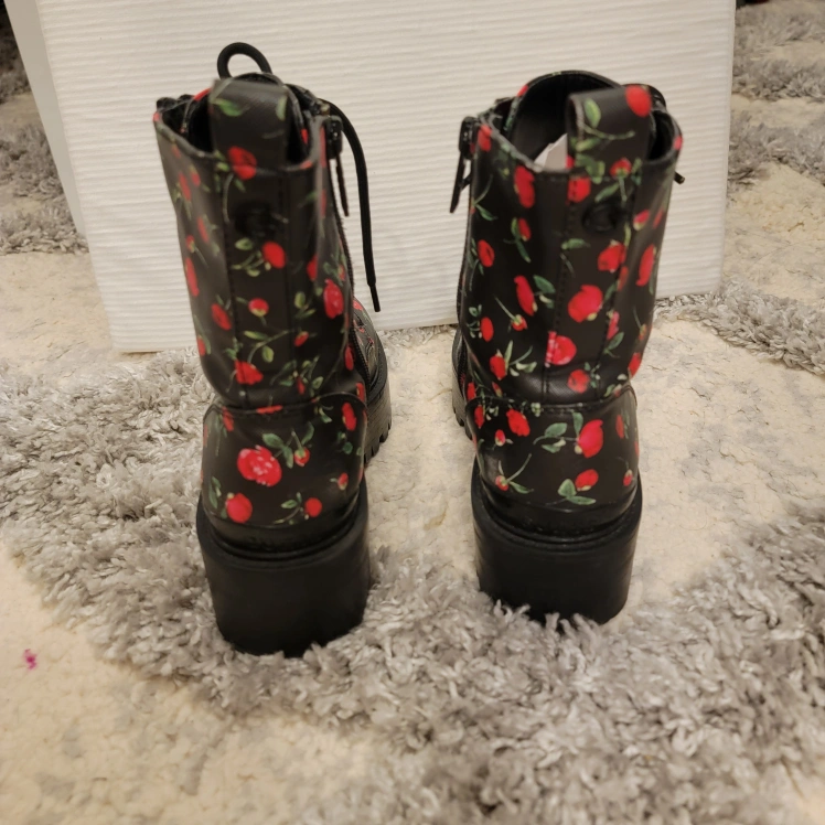 Black combat boots with a red rose floral pattern. Features a side zipper and lace-up front. Chunky platform sole.