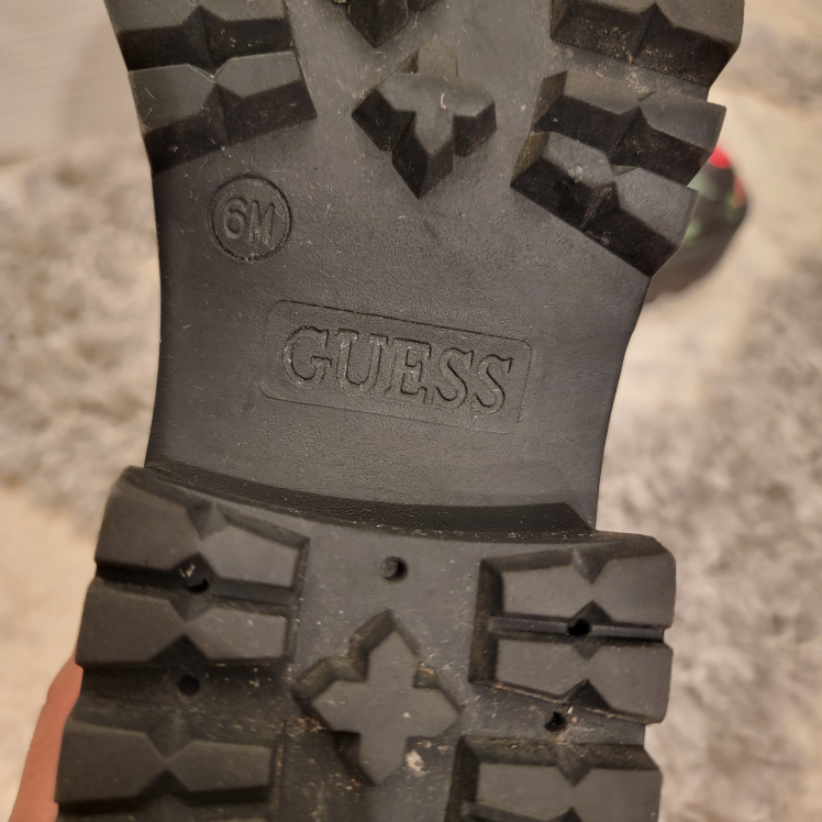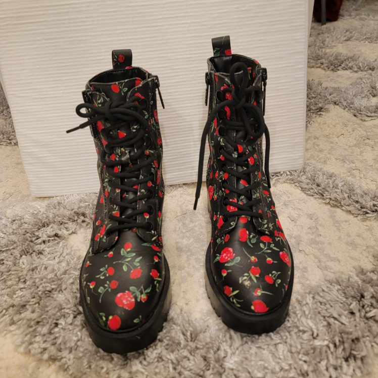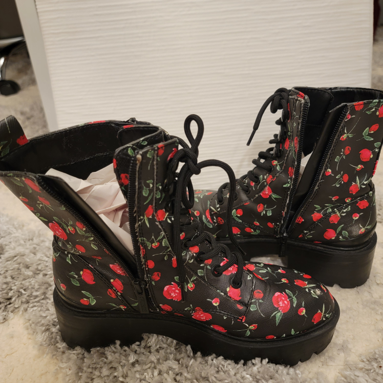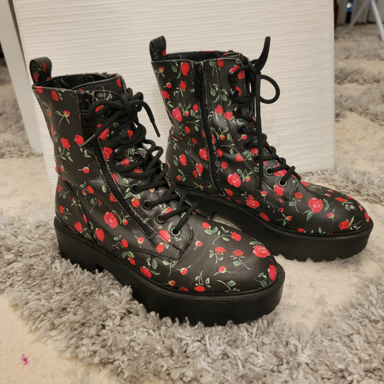 Black combat boots with a red rose floral pattern. Features a side zipper and lace-up front. Chunky platform sole.