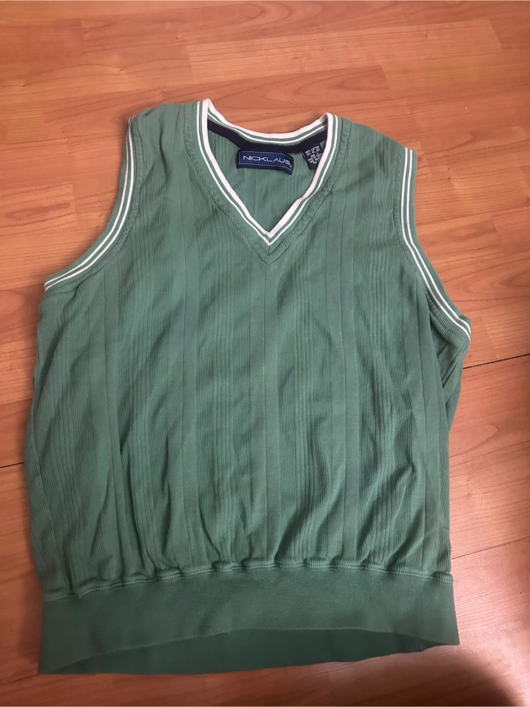 Here's a 100% cotton Nicklaus sweater vest in a lovely green colour! It's perfect for layering or wearing on its own. It's in great condition and ready for a new home! Slight bleach stops not very noticeable