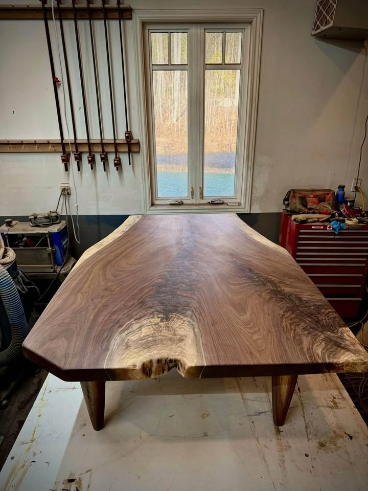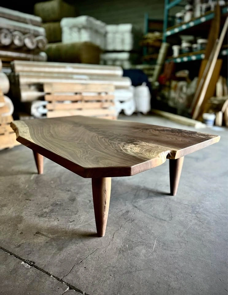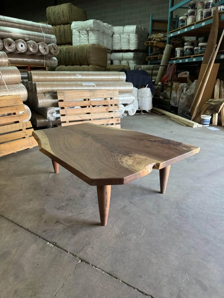 Walnut coffee table with hand-shaped, solid wood legs. This beautiful and functional coffee table is the perfect addition to any bright, modern living room. This heirloom-quality table is 54.5" L x 38.5" W x 18 H, and made from kiln-dried, Ontario hardwood. It is finished with a durable, stain resistant wood finish. We can also custom make a similar table in larger or smaller dimensions. Can be viewed in person in Rexdale, ON, by appointment. Feel free to message if you have any questions!