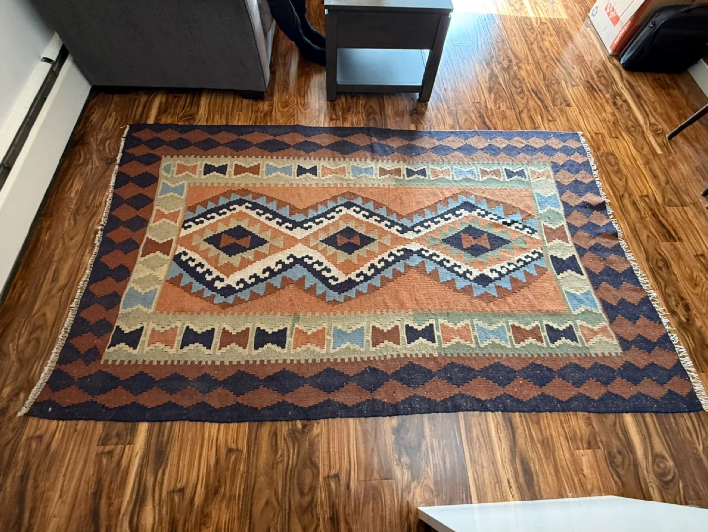 Area wool rug features geometric pattern in earthy tones.
