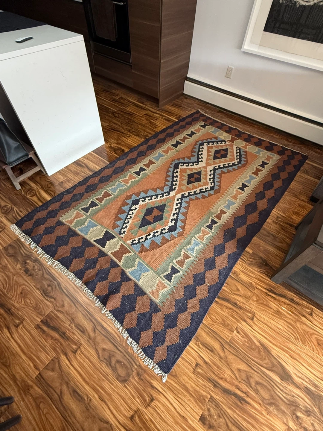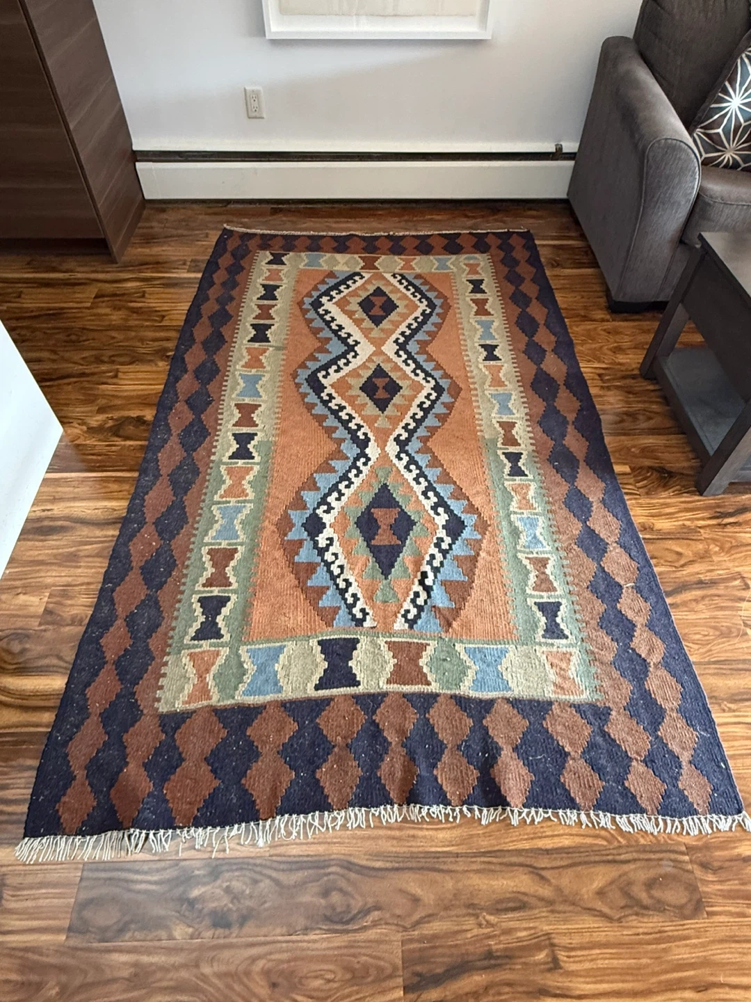 Area wool rug features geometric pattern in earthy tones.