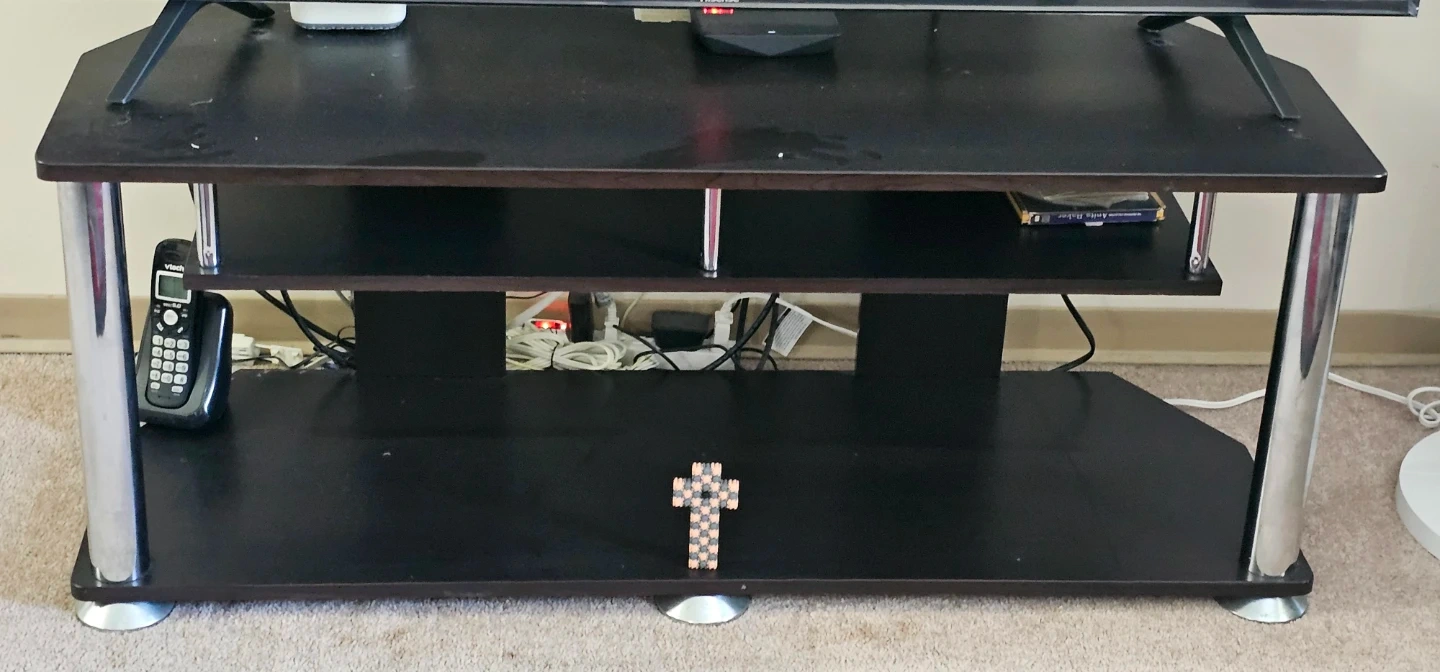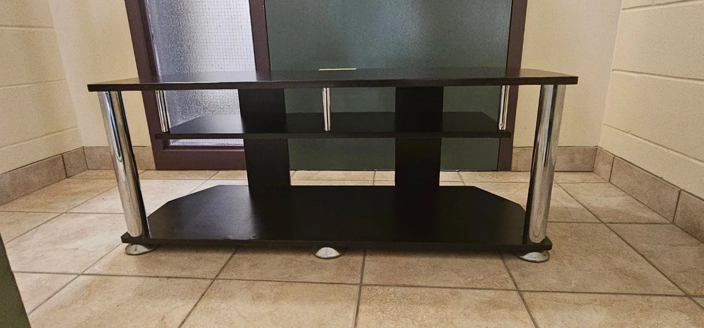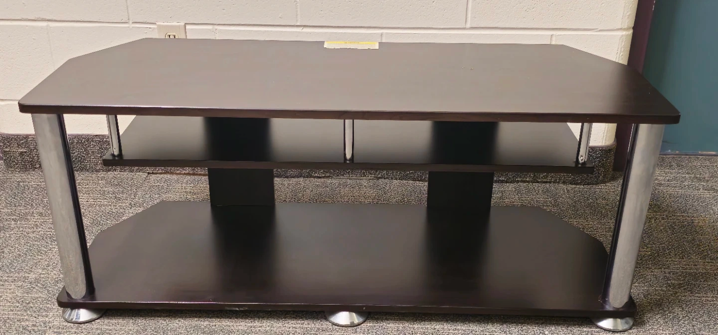 A dark brown TV stand with two shelves and shiny metal legs. It's a practical piece for your entertainment setup. The stand has a modern look that fits most living rooms. Use it to organize your TV and media devices!