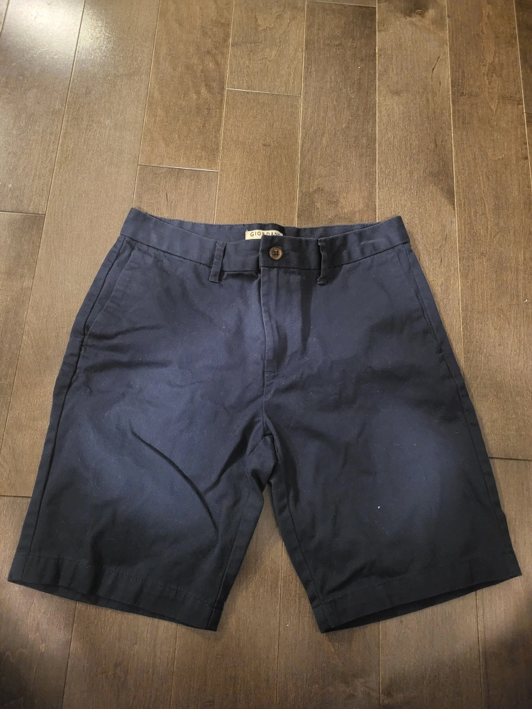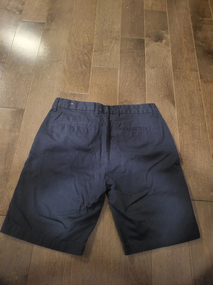 Dark blue shorts. Made with a button and zipper closure. Features side and back pockets. They are perfect for a walk in the park on a sunny day.
