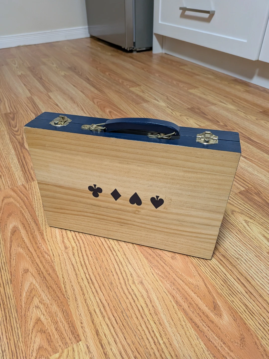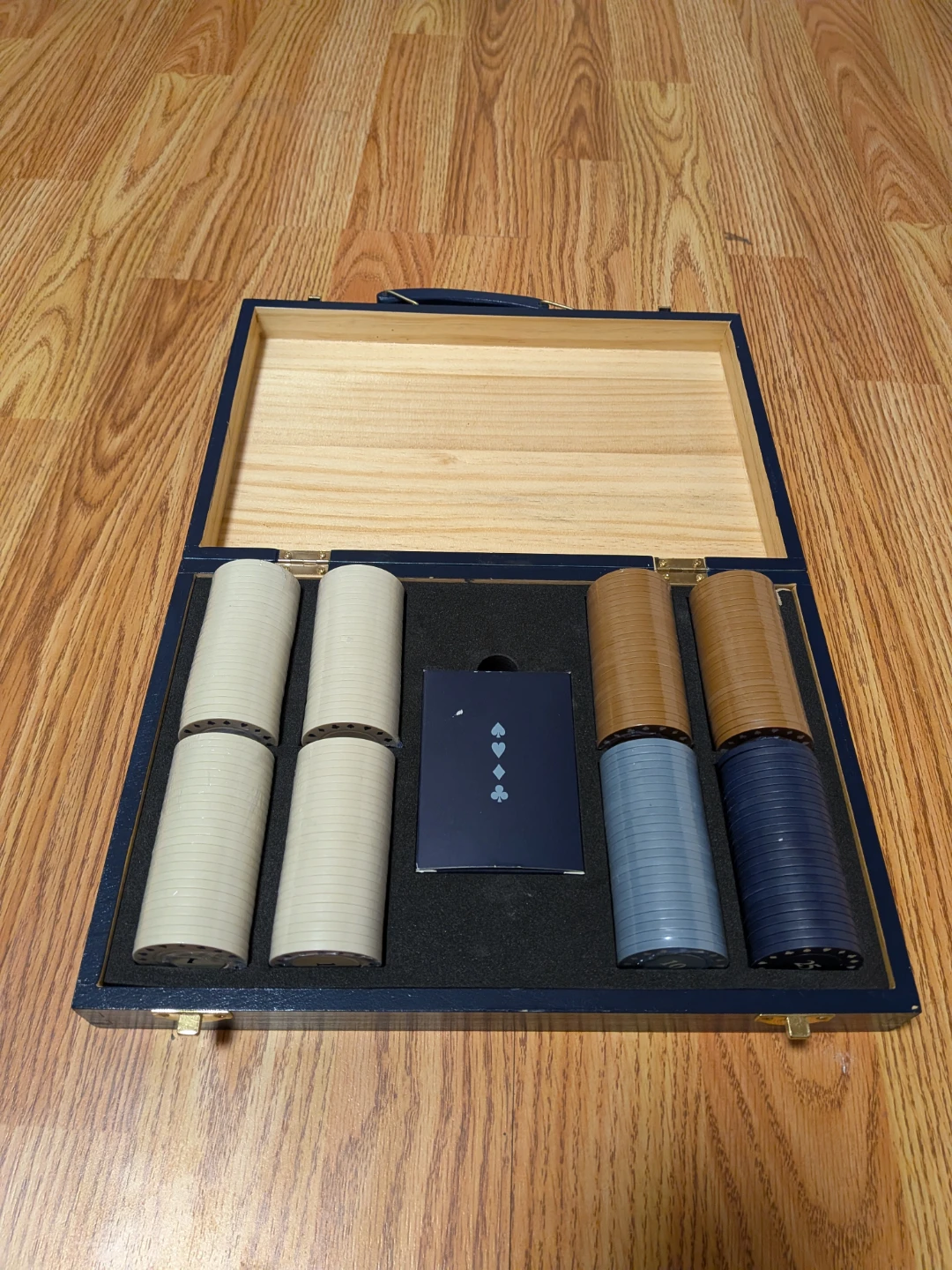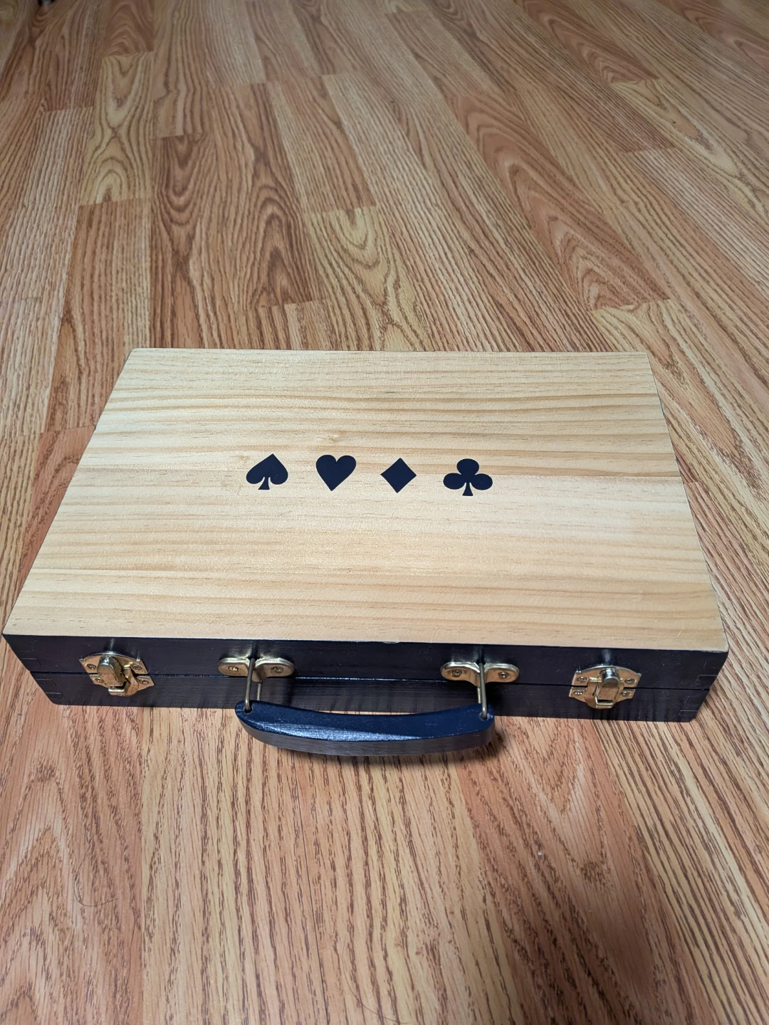 Poker chip set in a wooden case with 200 poker chips in various colours and a deck of cards. Brand new, only one set of chips opened