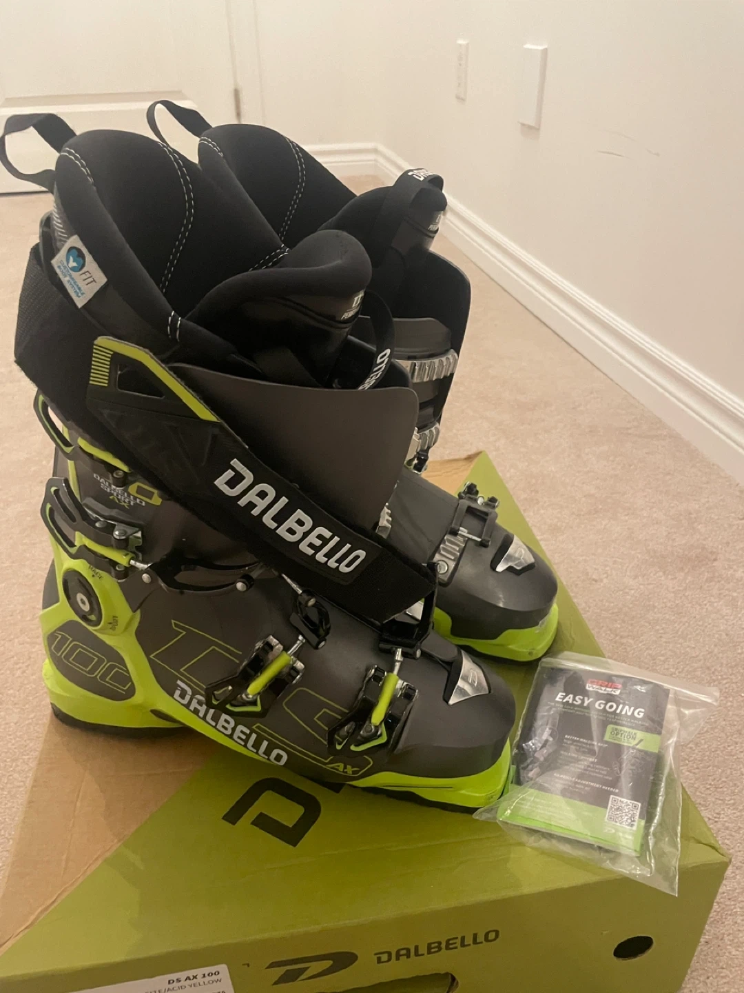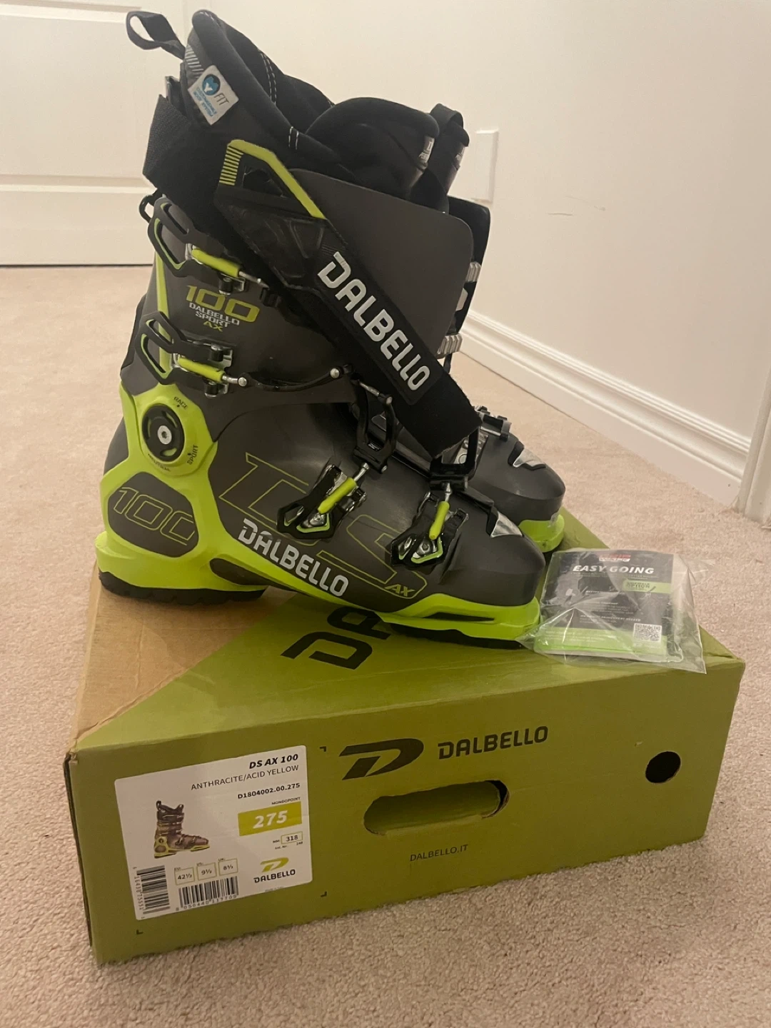 Selling a pair of Dalbello DS AX 100 ski boots in great condition. They are a size 9 (US). The box is included. These boots are anthracite and acid yellow in colour.