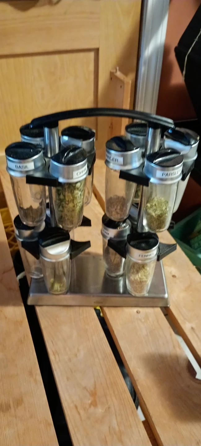 This is a rotating spice rack that comes with 10 glass jars. It features labels for common spices like basil, chives, parsley, fennel, garlic, and marjoram. The rack is made of stainless steel and has a modern design.