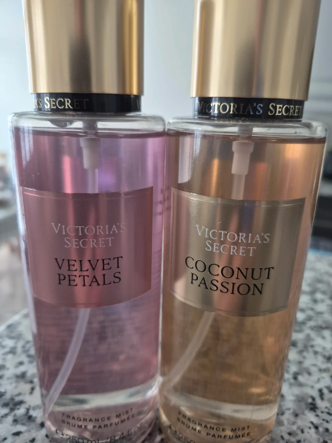 Set of two Victoria's Secret fragrance mists. Includes Velvet Petals and Coconut Passion scents. Each bottle is 250ml / 8.4 fl oz.