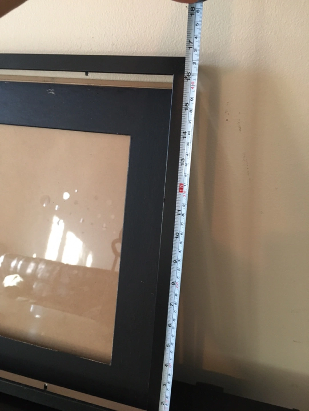 Black picture frame. It's a sturdy frame, perfect for displaying photos or art. Outer dimensions are approximately 29 inches by 18 inches.with glass