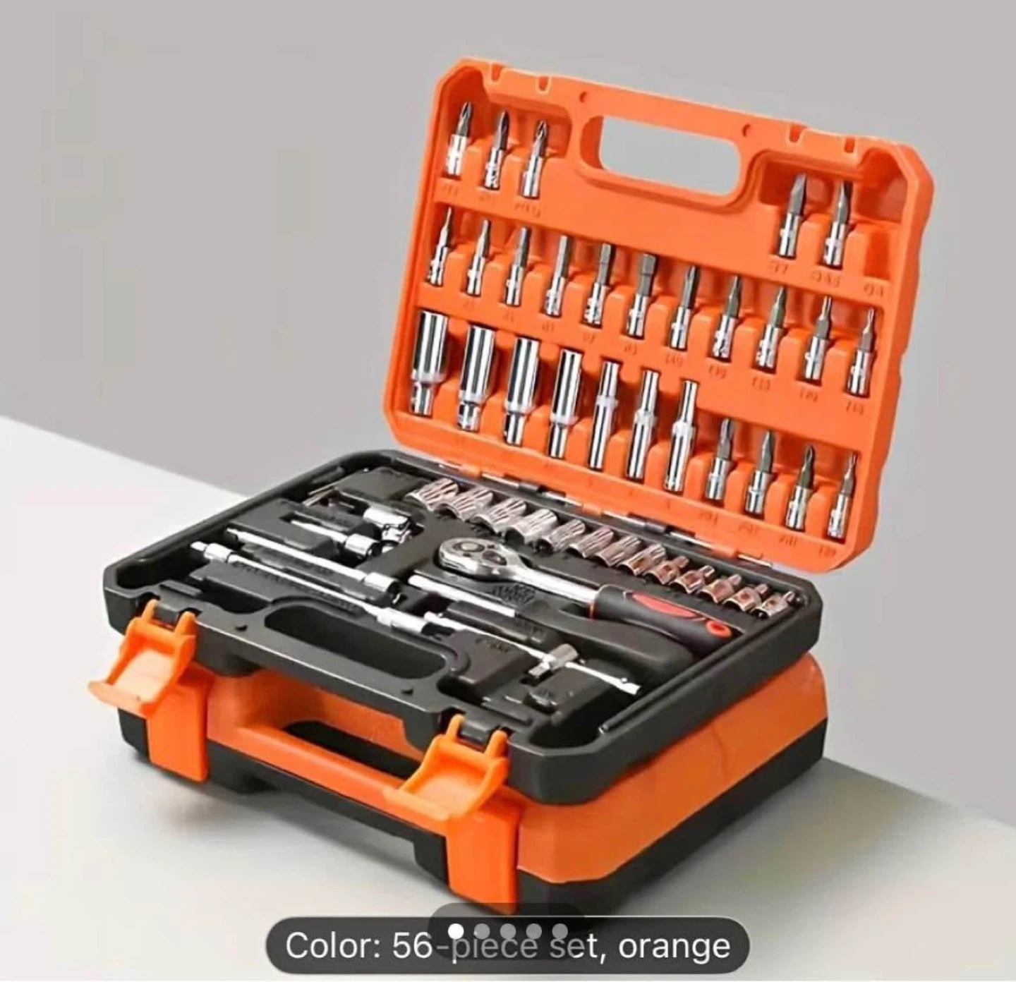 This 56-piece socket set includes various hex bits and sockets. It's all housed in a durable orange and black carrying case. Great for home repairs or DIY projects!