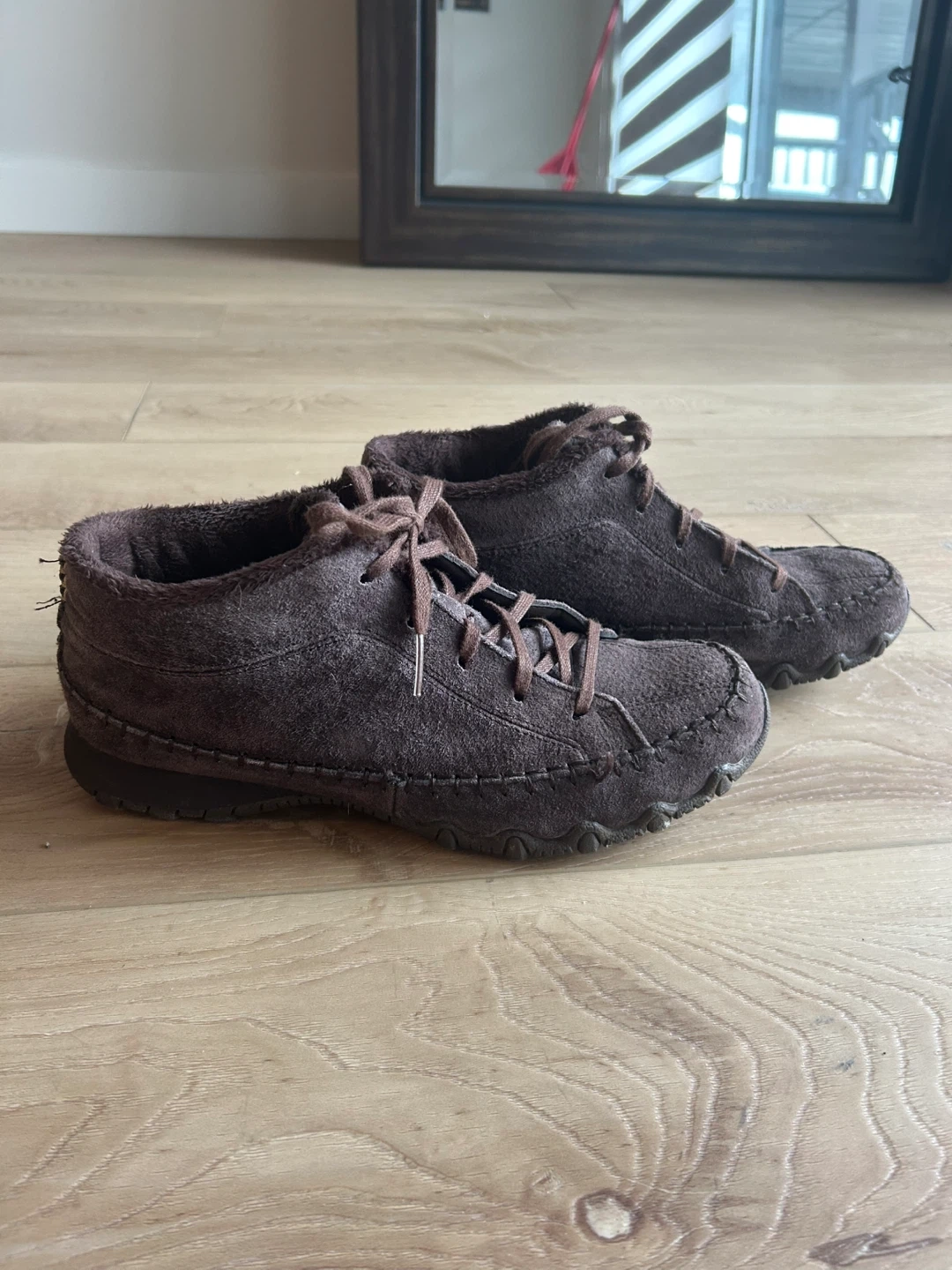 Cozy brown suede moccasin boots from Skechers. These are lined with soft faux fur for extra warmth and has soft interior for foot soles. Features a lace-up front and a flexible sole.