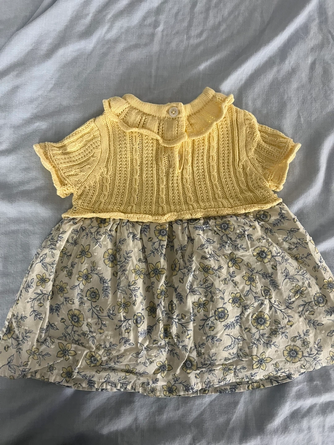 Cute yellow and floral baby dress, perfect for your little one! It's in great condition and ready for a new home. The dress features a charming floral pattern on the skirt and a lovely yellow knitted top. It's a sweet and stylish outfit for any occasion