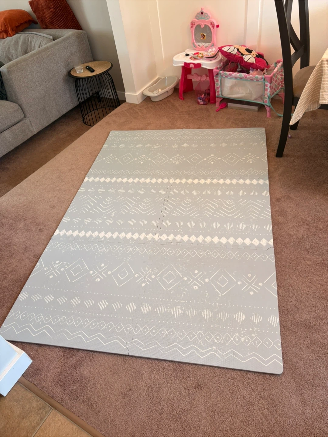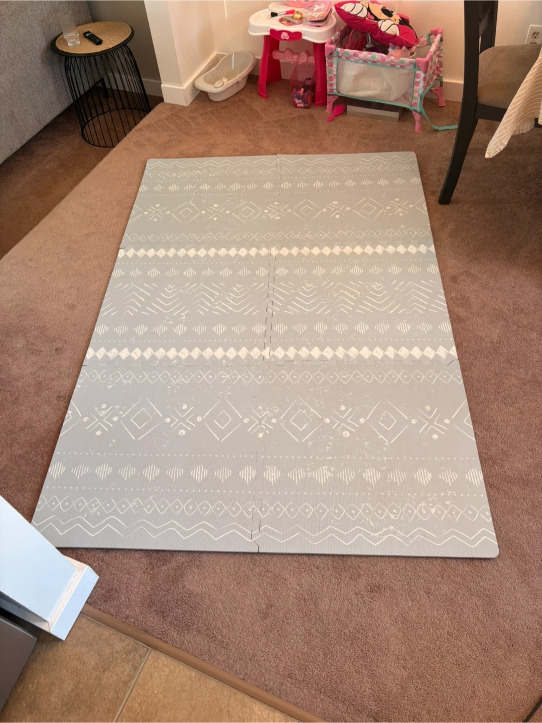 Interlocking foam play mat with a light grey and white geometric pattern. It's made of foam tiles that connect together. Provides a soft surface for play areas.