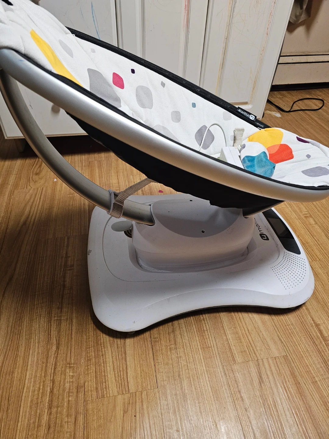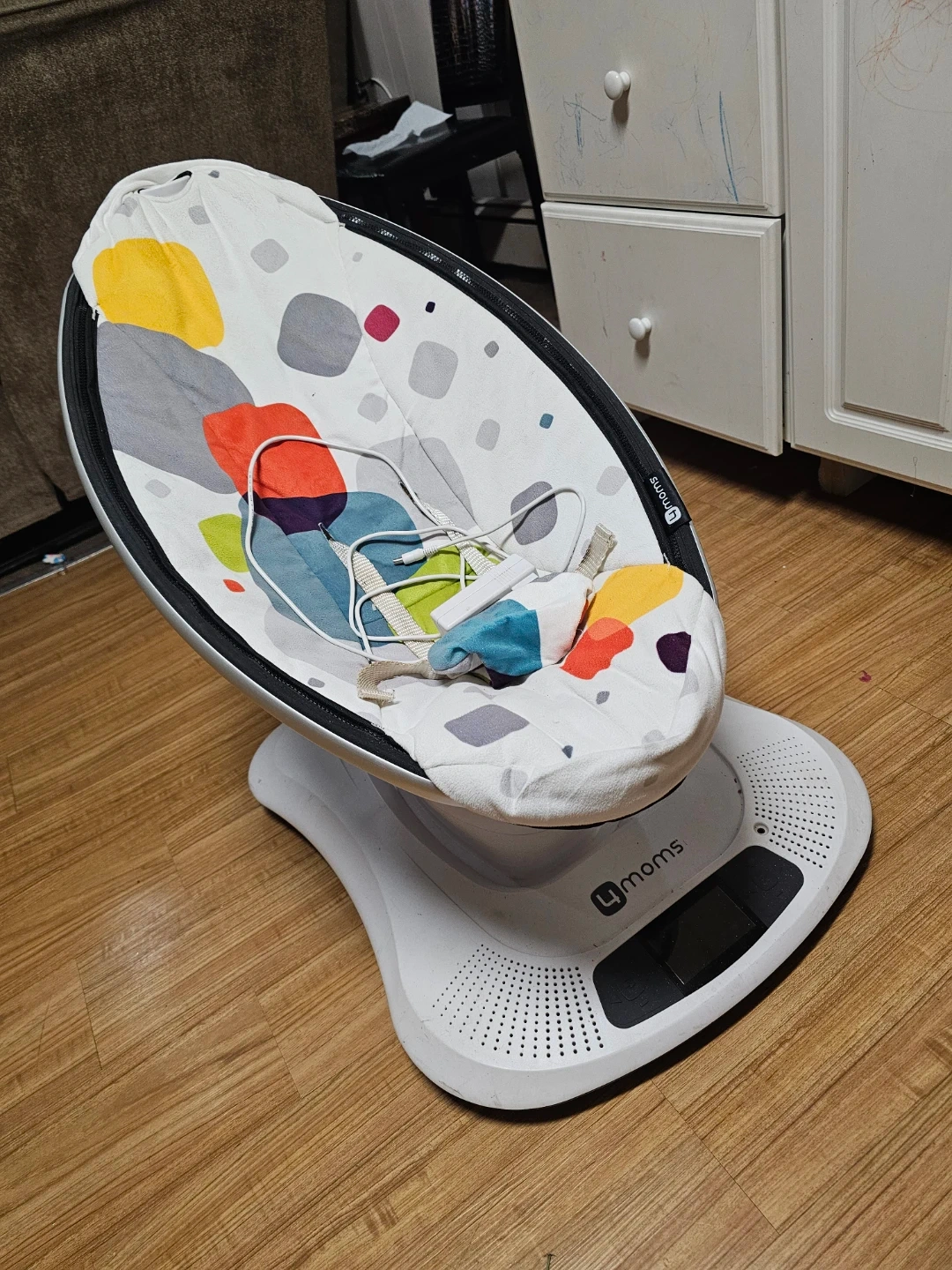 This is a 4moms MamaRoo rocking infant seat. It has a colorful patterned fabric seat. The base is white with speaker grills. It's designed to gently rock your baby.