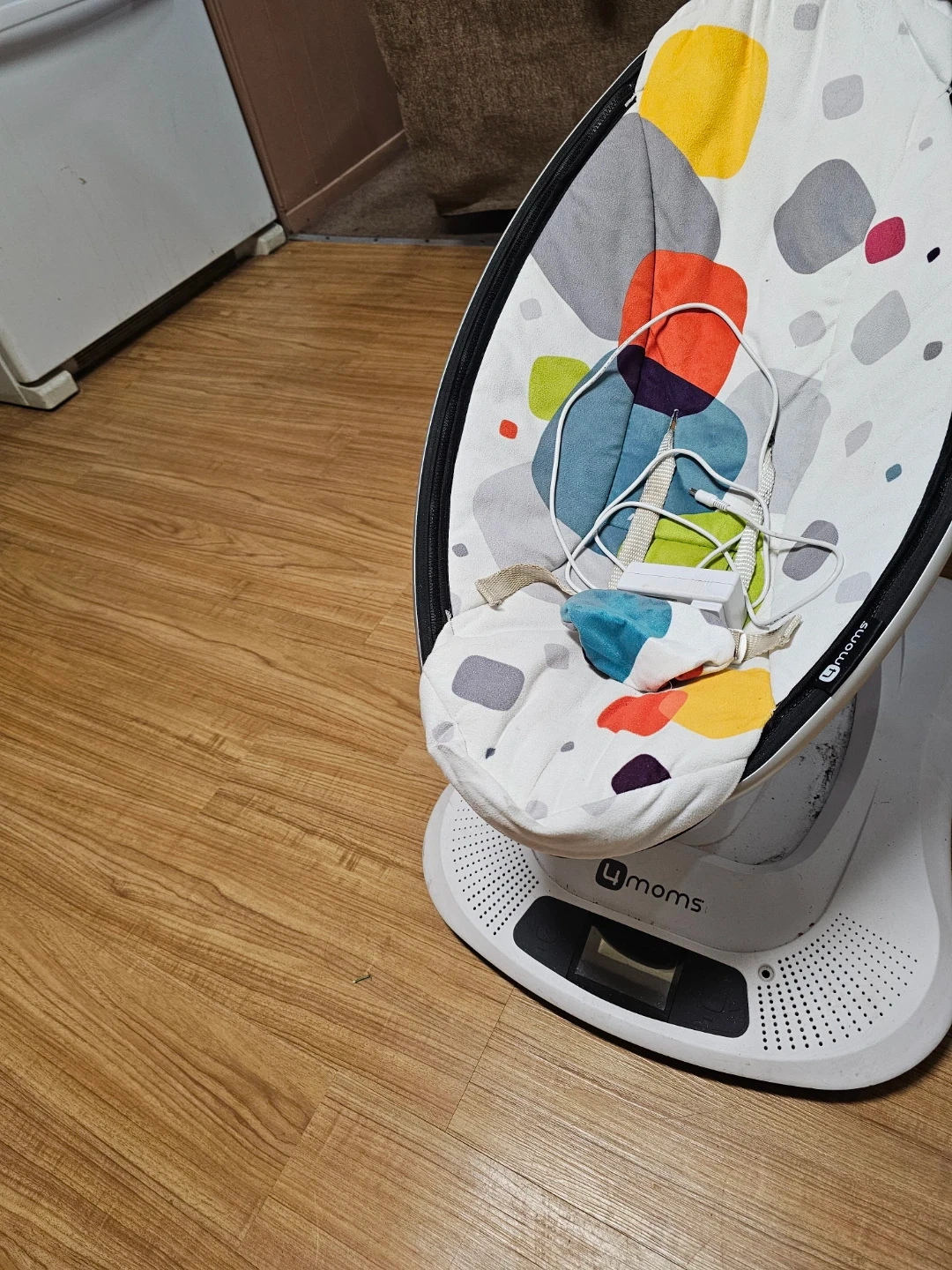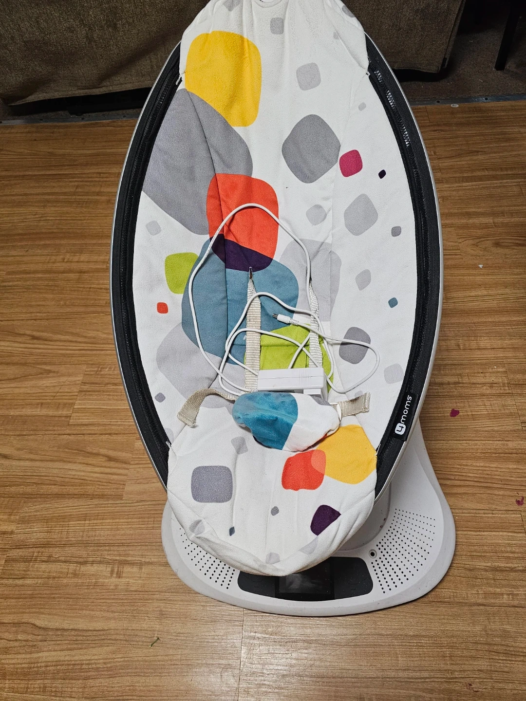 This is a 4moms MamaRoo rocking infant seat. It has a colorful patterned fabric seat. The base is white with speaker grills. It's designed to gently rock your baby.