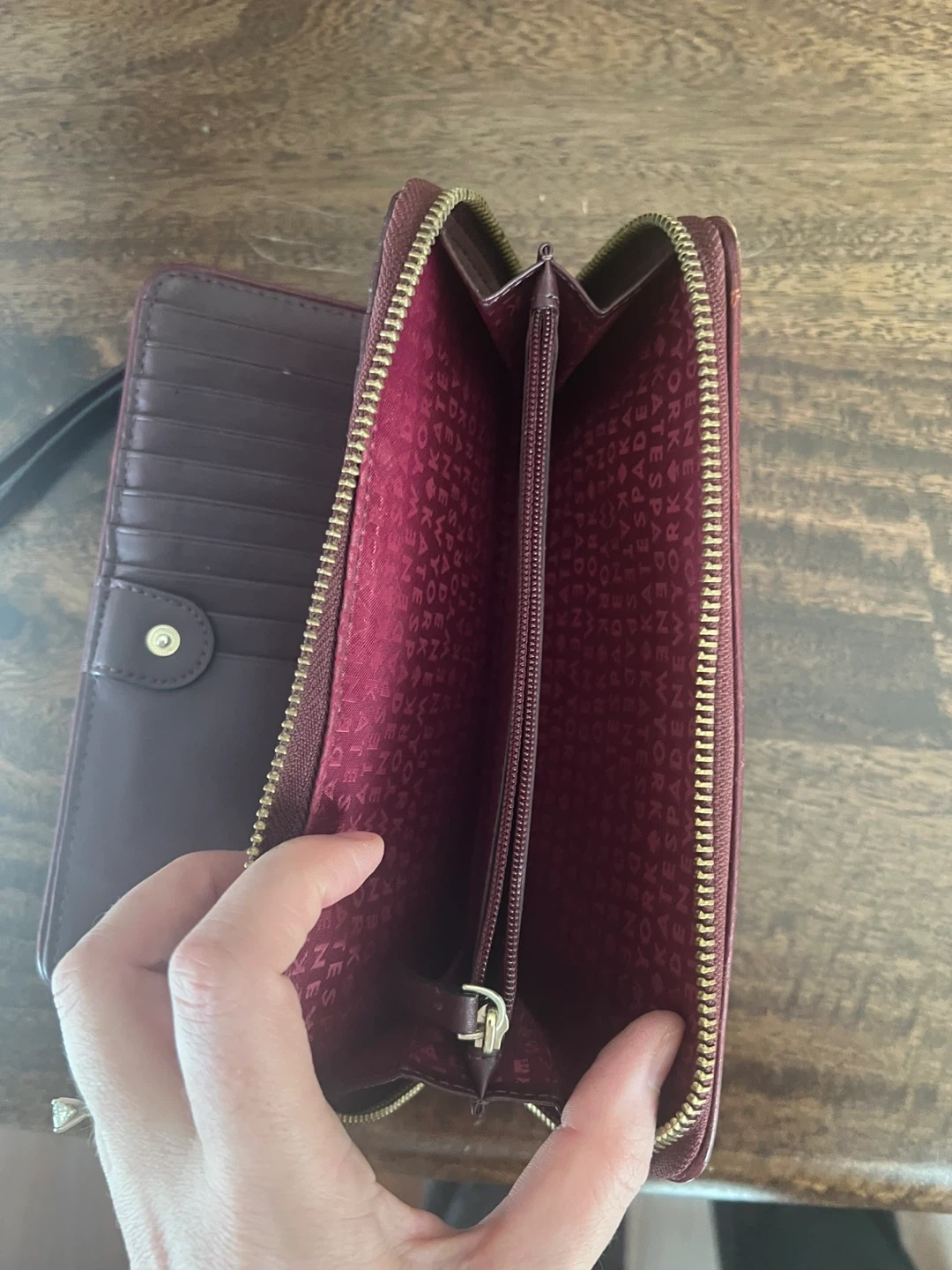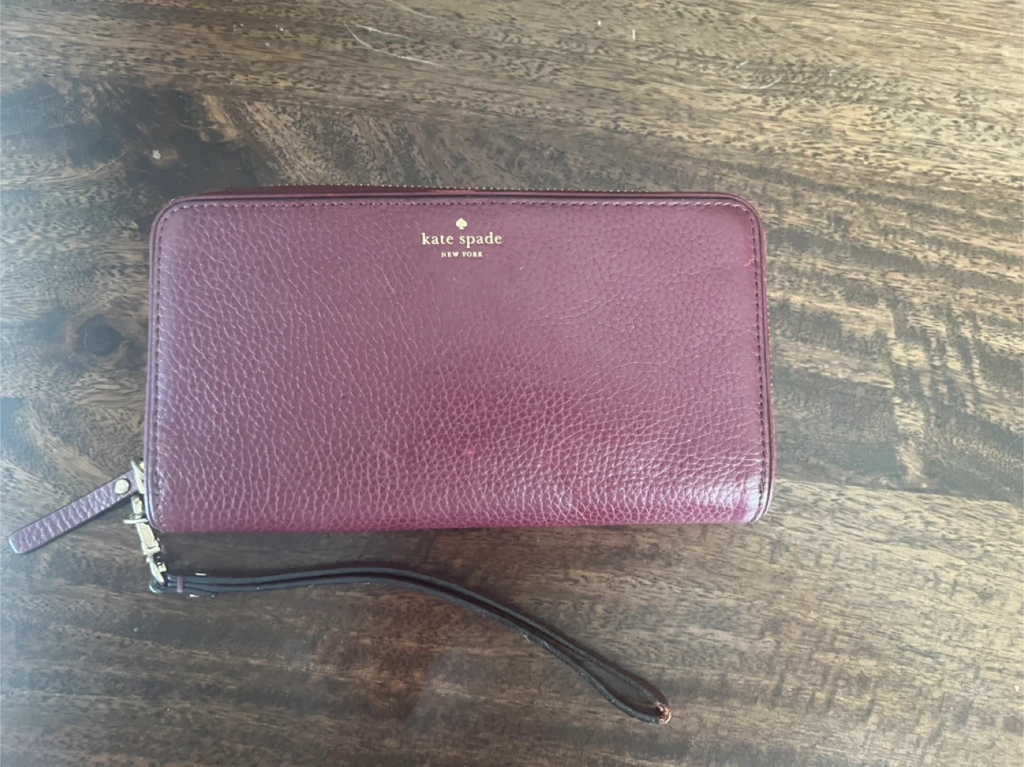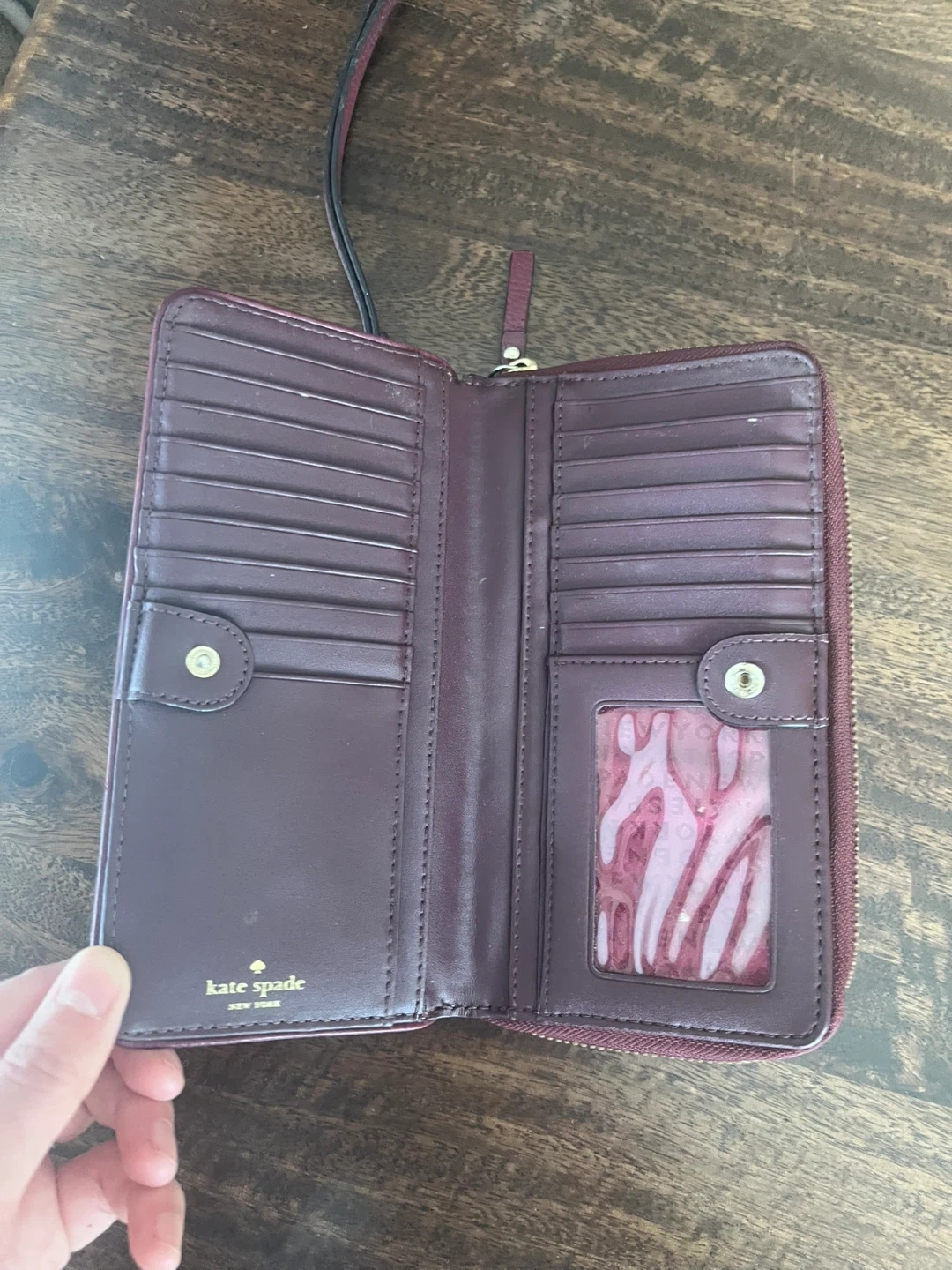 This is a Kate Spade wallet. It's a bifold style with a zip-around closure. Features multiple card slots, a clear ID window, and a zippered coin pocket.