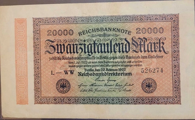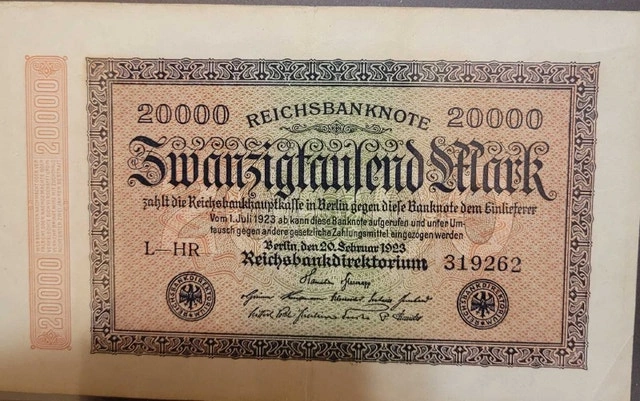 Buy & SellPre War German BanknotesPre War German Banknotes$154 1923 German Banknotes, 20,000.00 Mark Denomination. All circulated and in very good condition. See pictures for details. Vintage, Antiques.WHERE TO MEETCheck LocationView MapSELLERJosephMaple50 reviews0 chats·0 favorites·6 viewsSEND CHAT TO SELLERHi Joseph! I’m interested in your listing.Hi Joseph! I’m interested in your listing.Get the Karrot app to chatSign In to chat