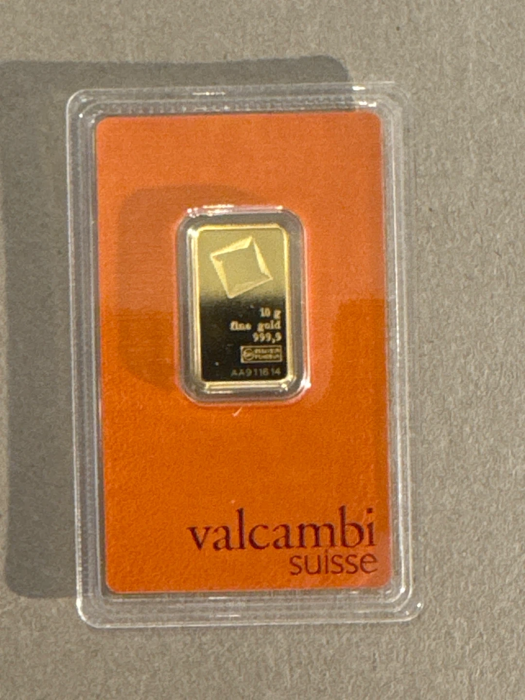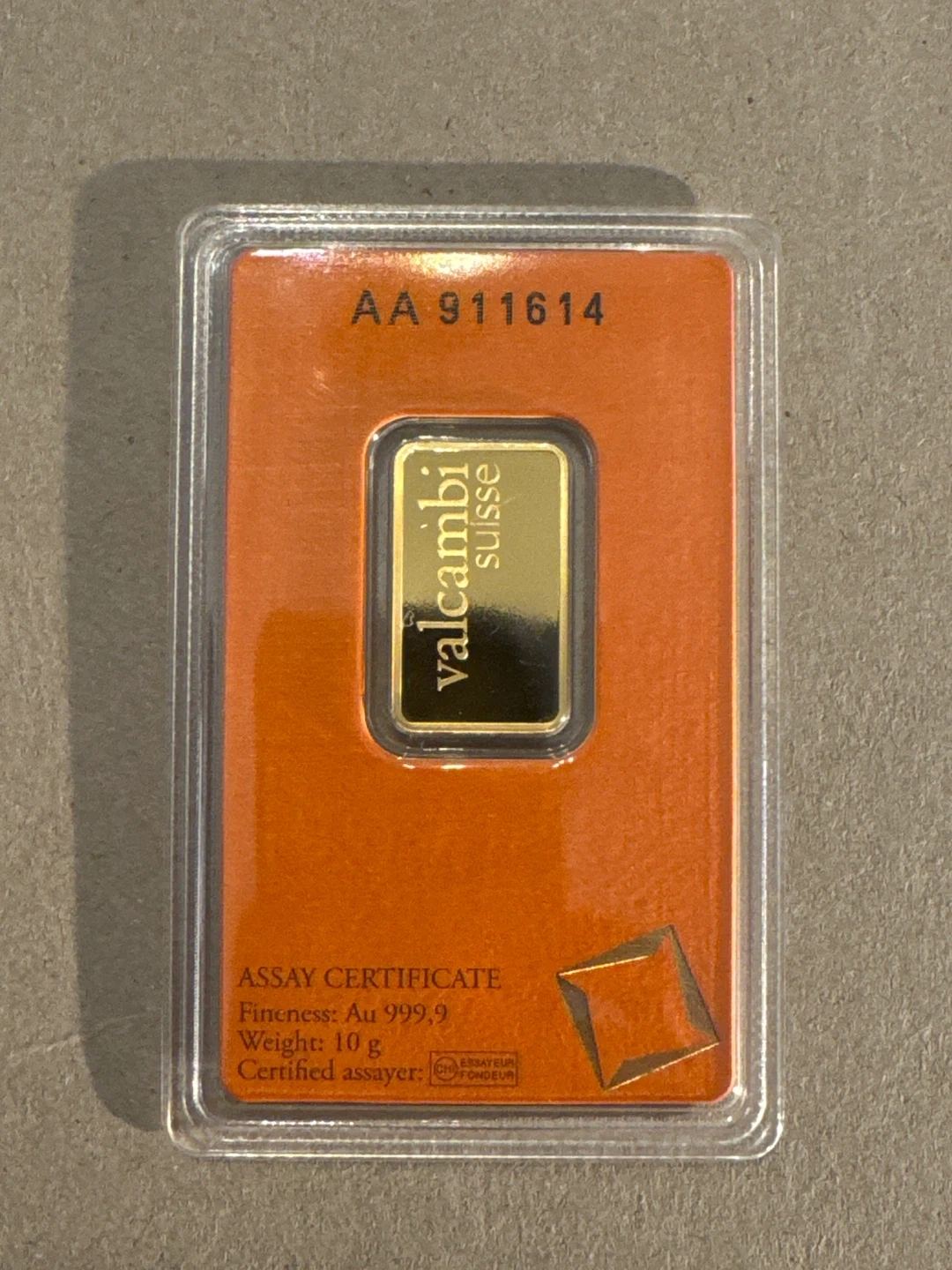 Valcambi Suisse 10g gold bar with assay certificate. Fineness: Au 999.9. Certified assayer information included.