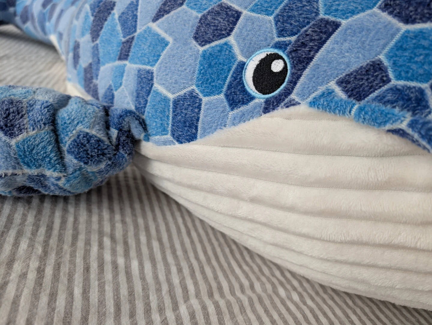 This plush whale toy features a unique blue patchwork design. It's made with soft, fuzzy material. This would make a fun cuddly friend for anyone!