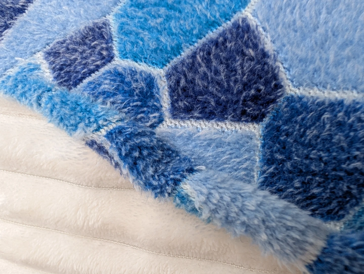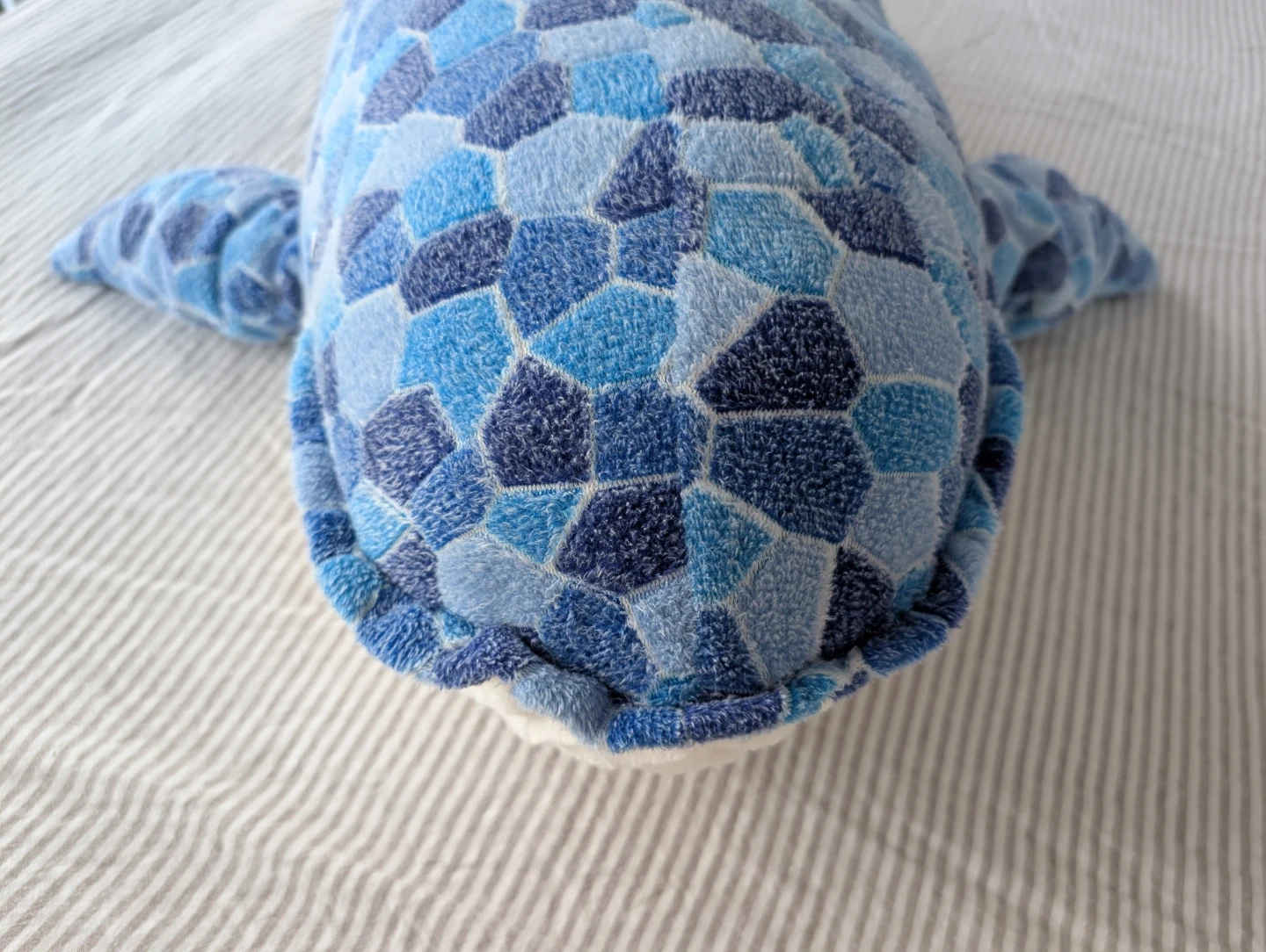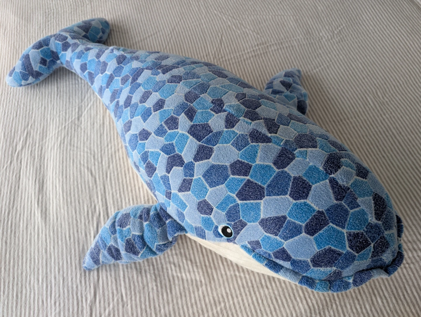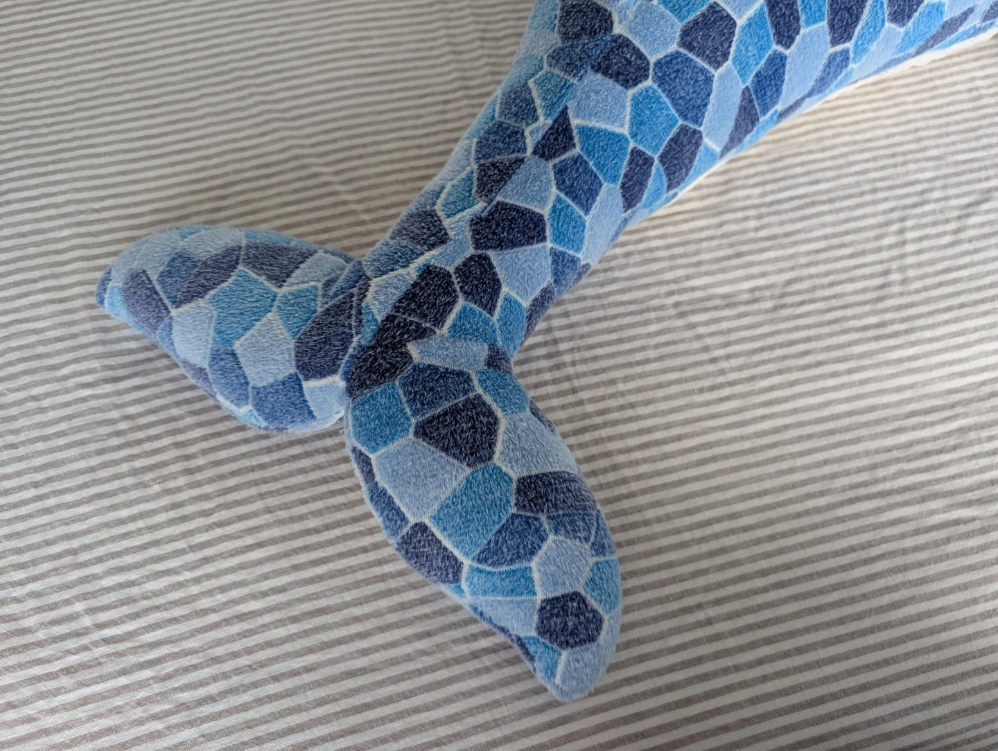 This plush whale toy features a unique blue patchwork design. It's made with soft, fuzzy material. This would make a fun cuddly friend for anyone!