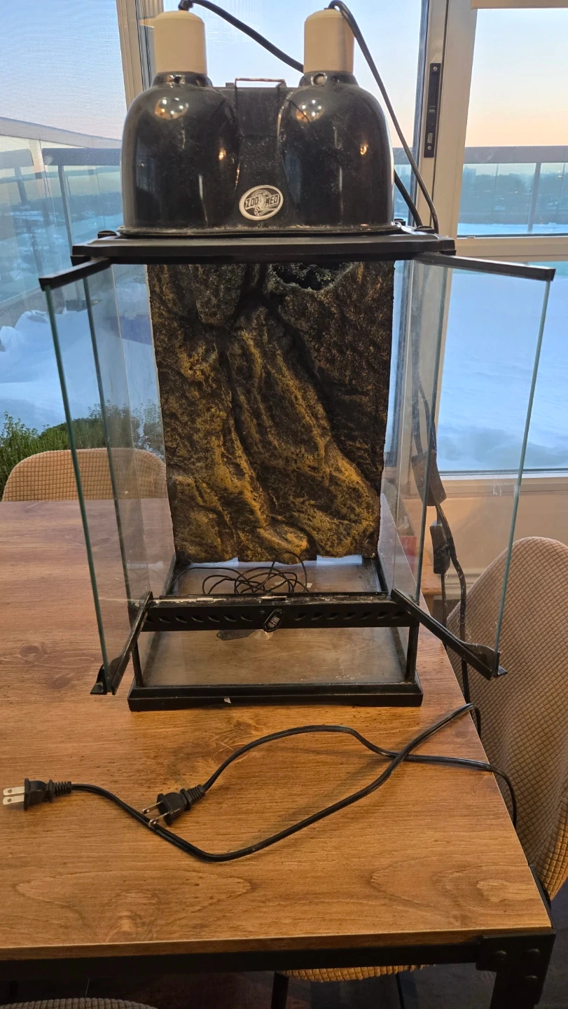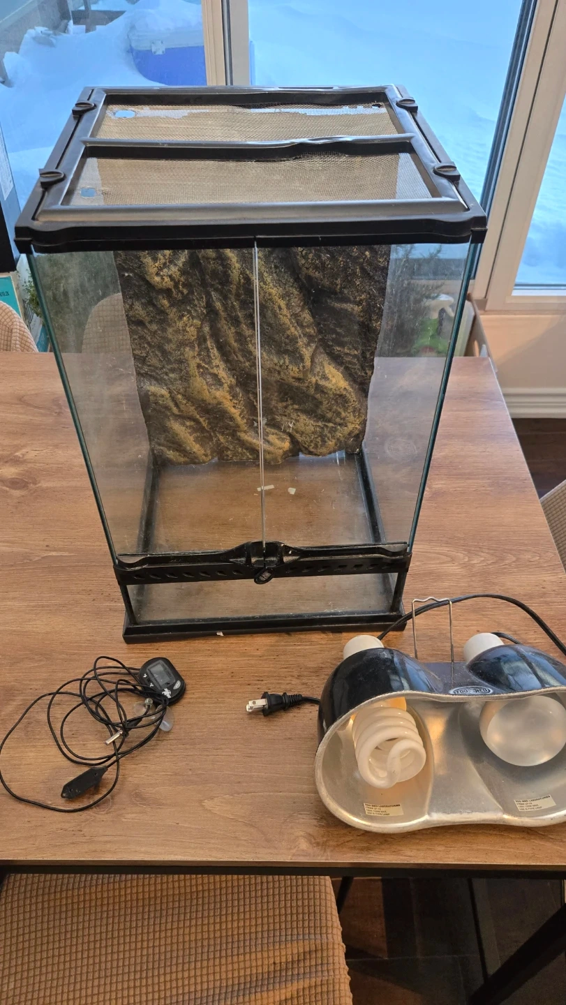 Included is a with dual lamp fixture containing a UV and heat lamps, and a dual thermometer/humidity gauge.