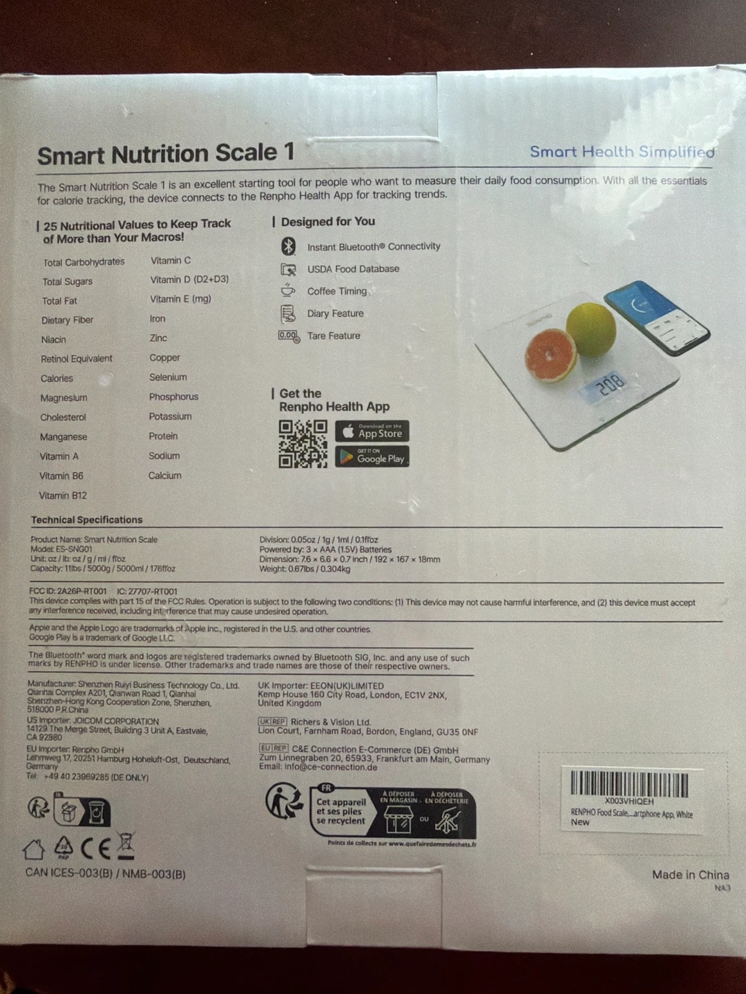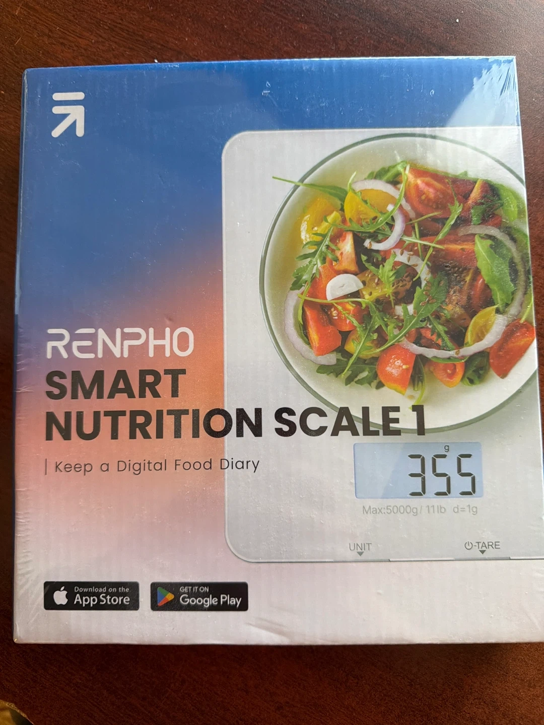 Brand new. Still in the plastic. This is the Renpho Smart Nutrition Scale 1. It helps track nutritional values and connect to the Renpho Health app. Scale capacity is 5000g/11lb.