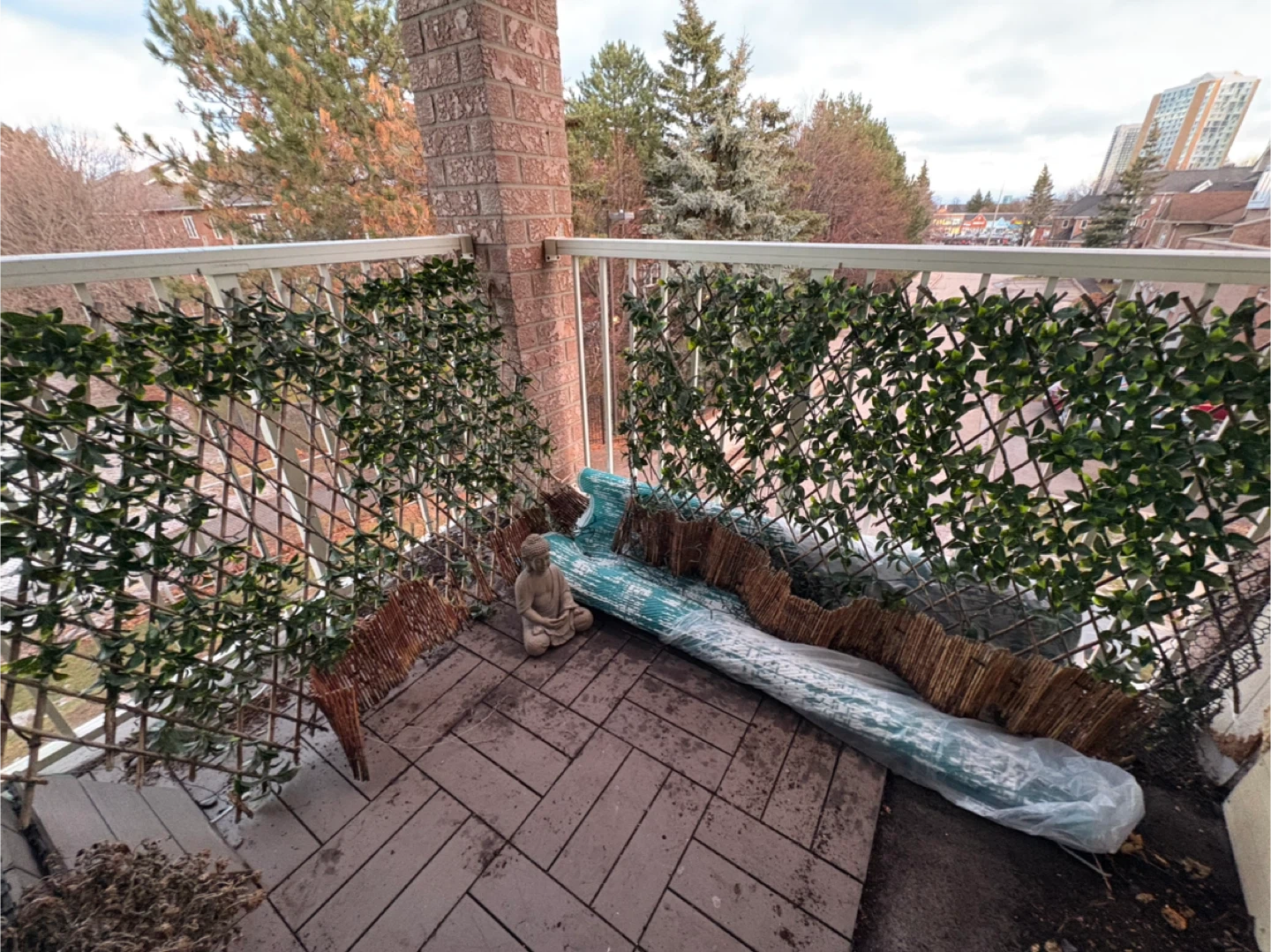 FREE 2 expandable faux leaf privacy fence. It's great for adding some greenery and privacy to your balcony or patio. The squirrels that frequent my balcony loved them so all damages caused by them. Free mat too. Was going to just throw them out unless someone has a possible use for it.