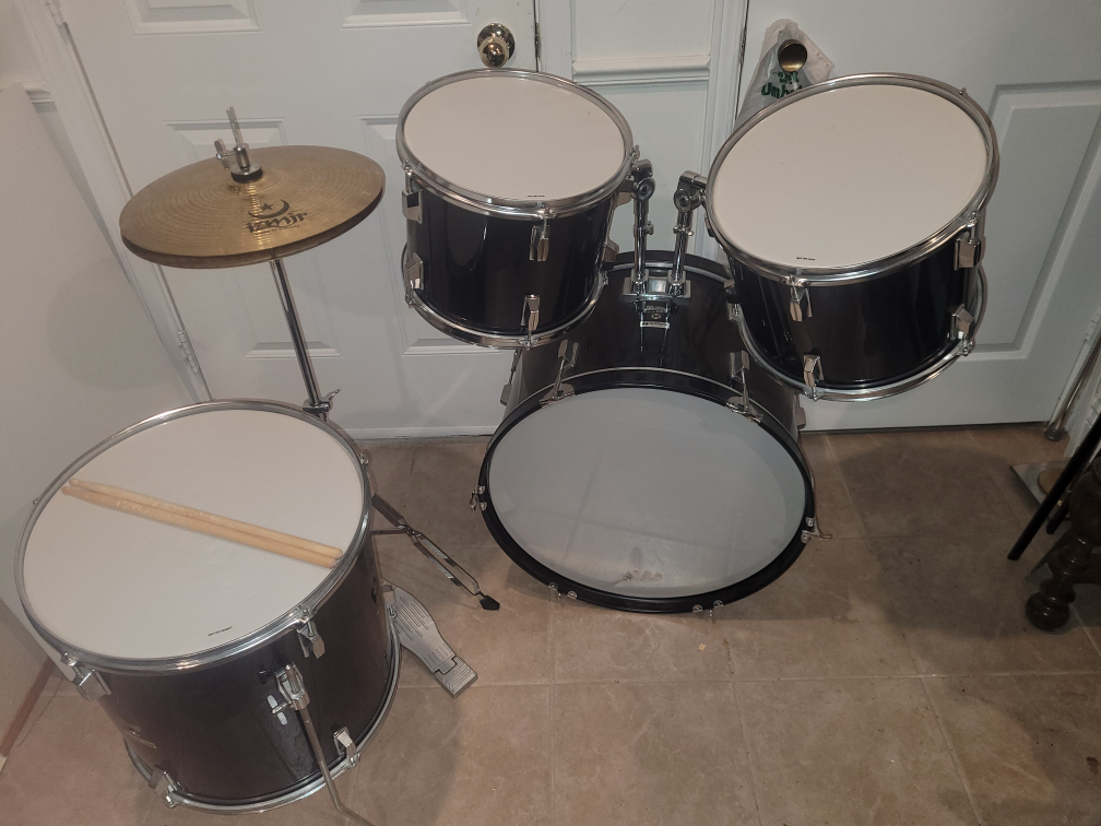 The bass drum has no pedal, and a small tear on the bottom, as seen in photos, easily repairable with a small piece of tape.