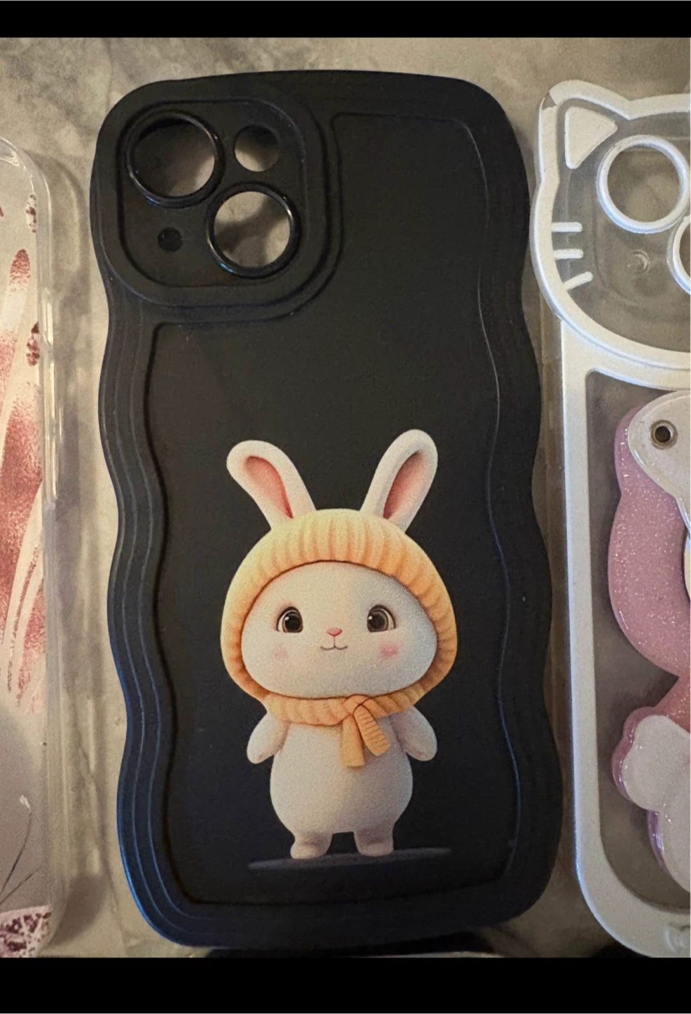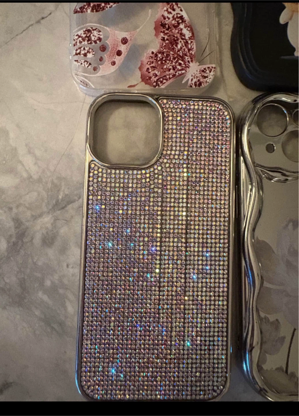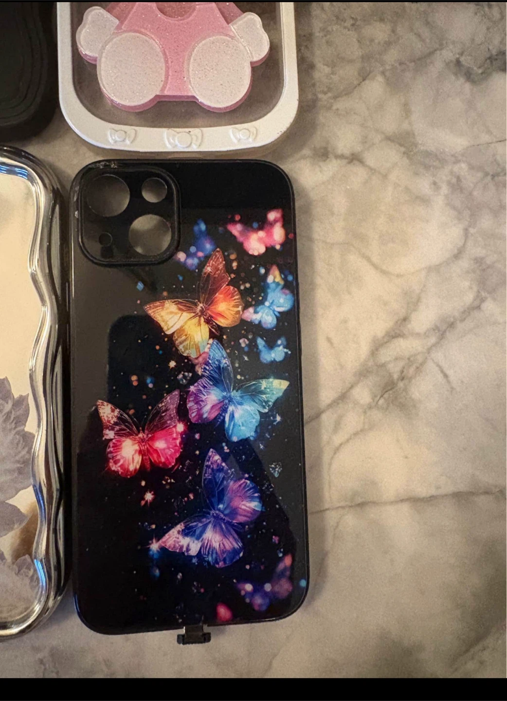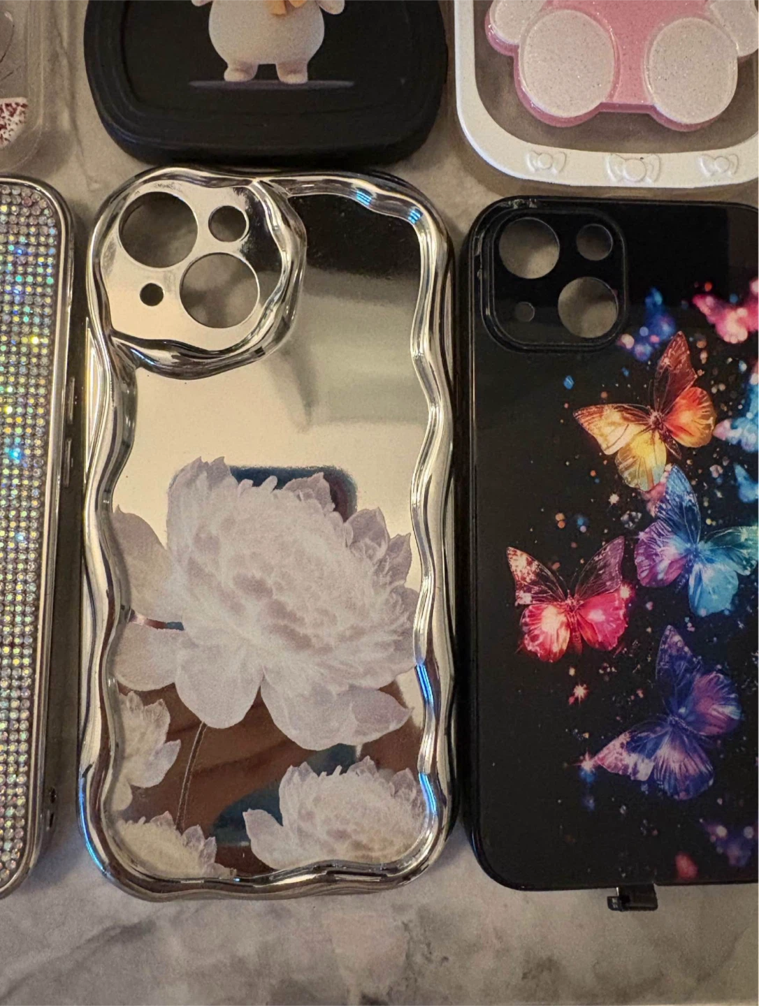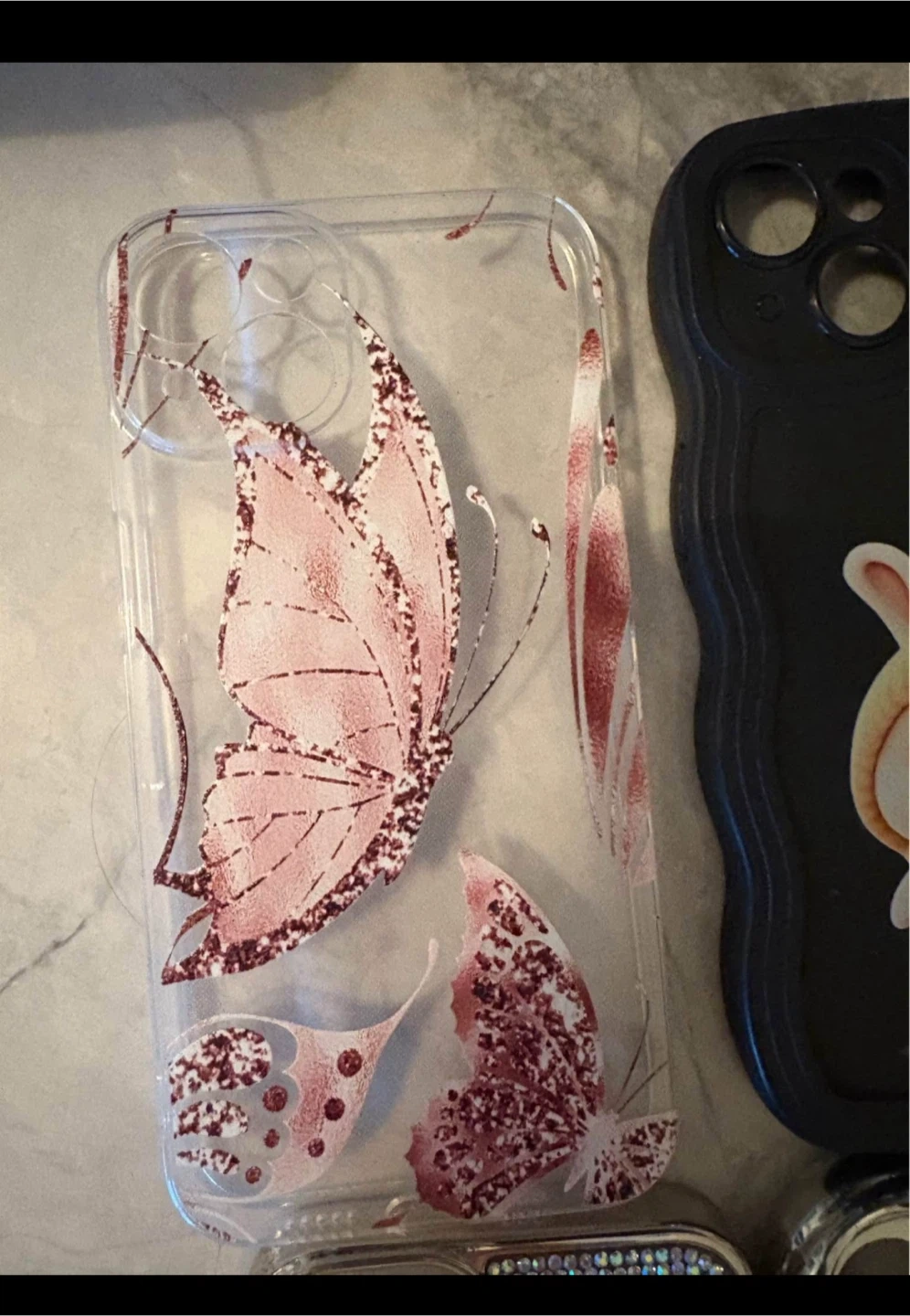 Selling a collection of cute iPhone cases! There's a clear case with a pink glittery butterfly, a Hello Kitty case and They're all in great shape and ready for a new phone.