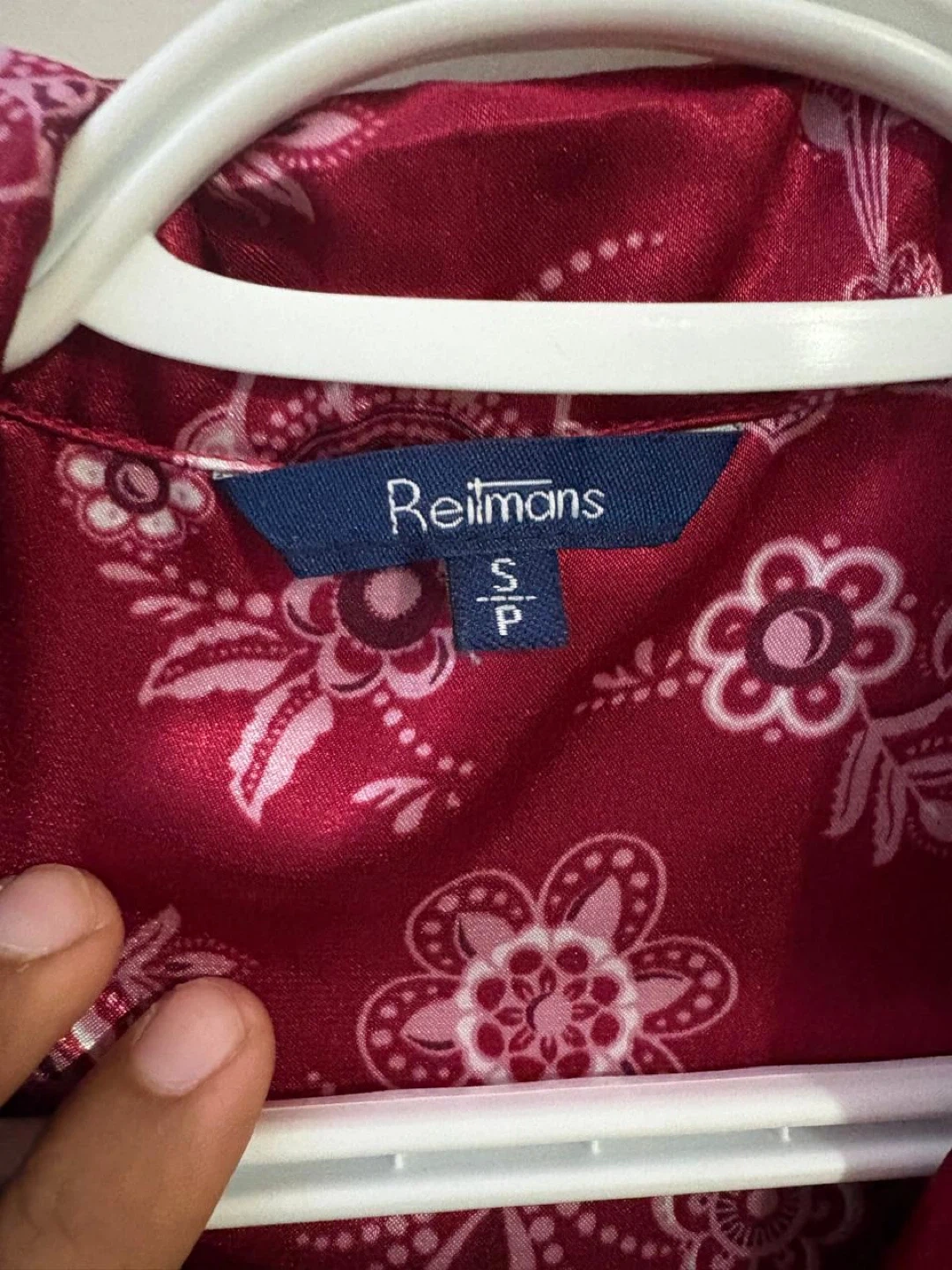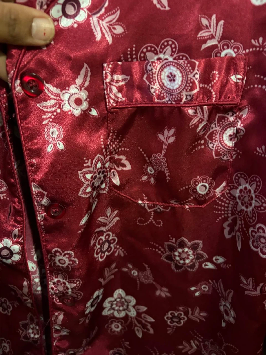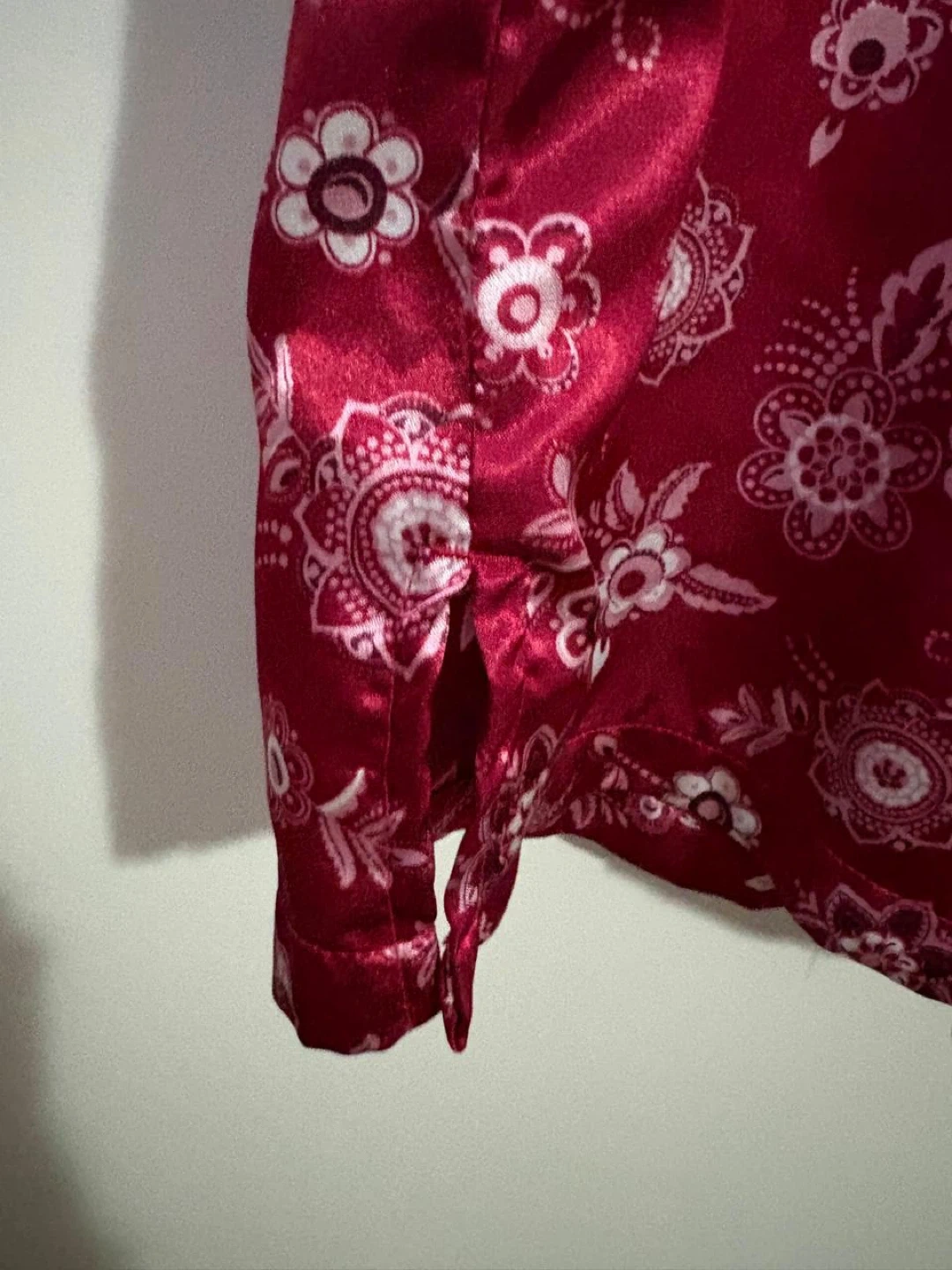 This satin pajama top has a bold floral print. It features a classic collar and button-up front with a chest pocket. It's made of shiny satin material.
