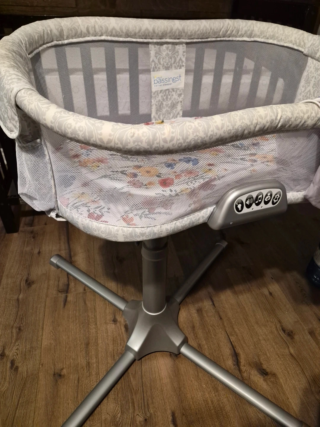 Halo swivel bassinet, all features work (vibrate- 2 speeds, music multiple modes, light- 2 options), can fit under most beds to keep baby close. Our little one has graduated to thd crib. Giving four like new fitted bassinet sheets as well.
