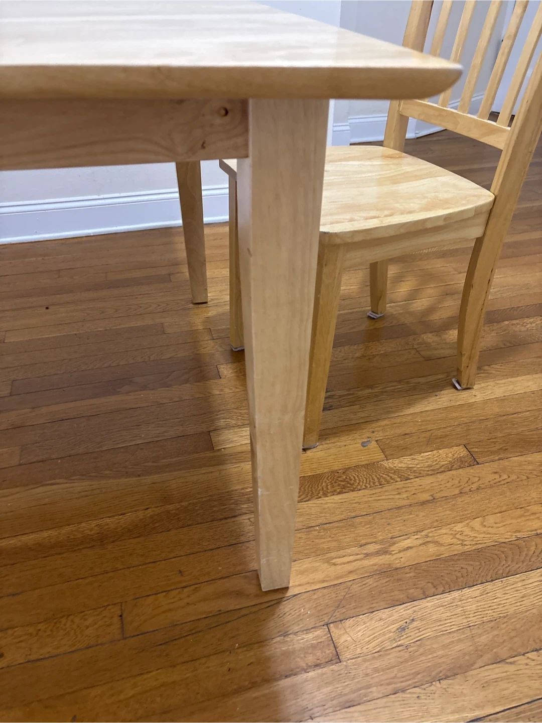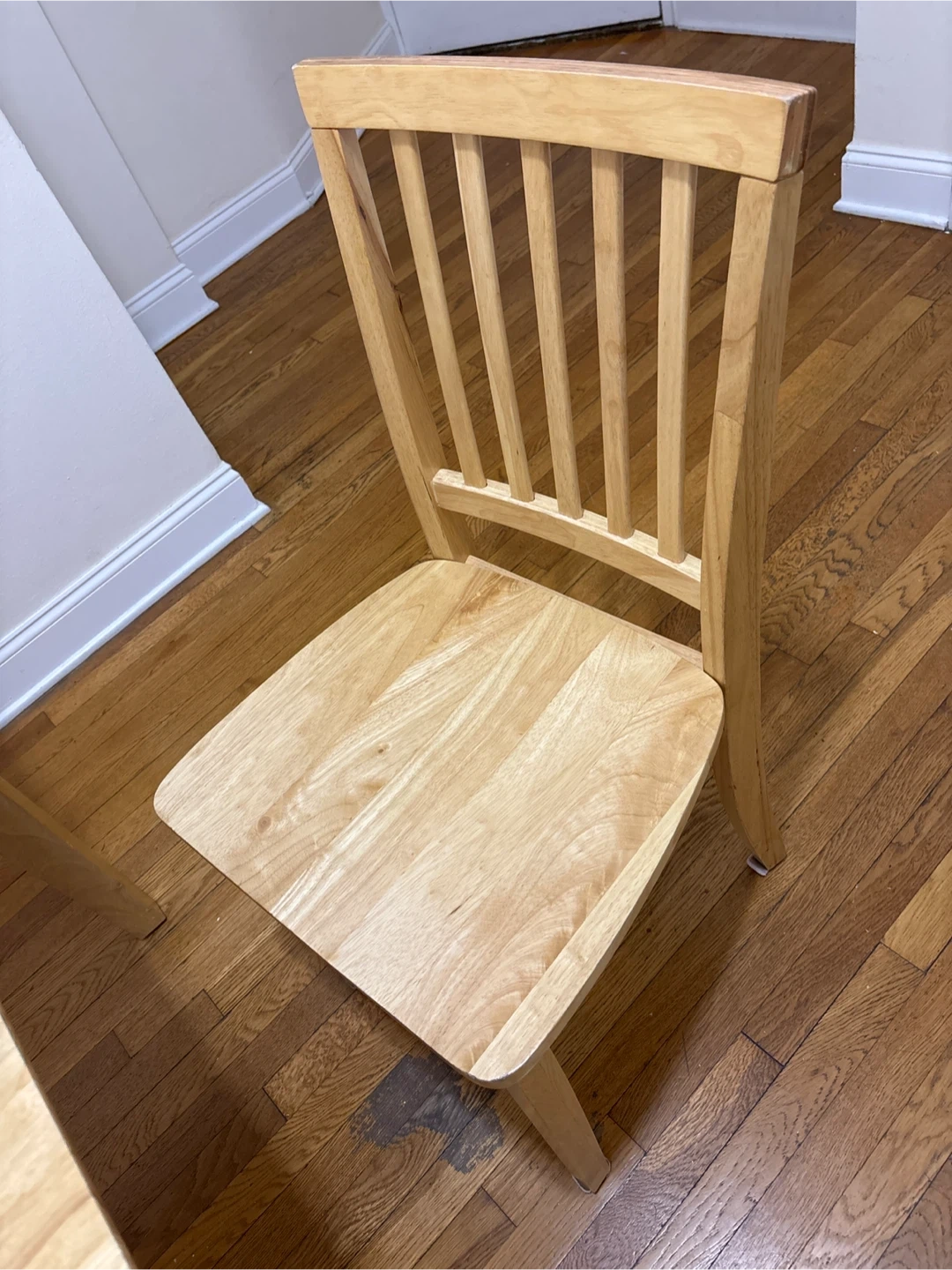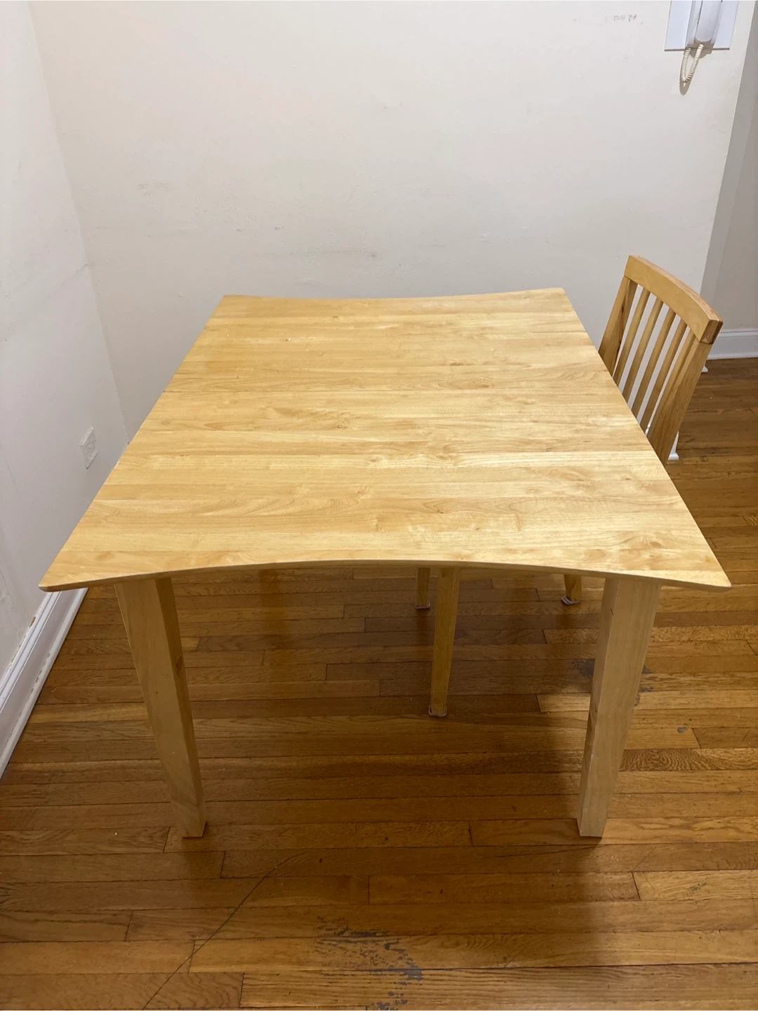 This is a light wood dining table with a matching chair. It's made of solid wood. The table has a curved design. This set is perfect for small spaces!