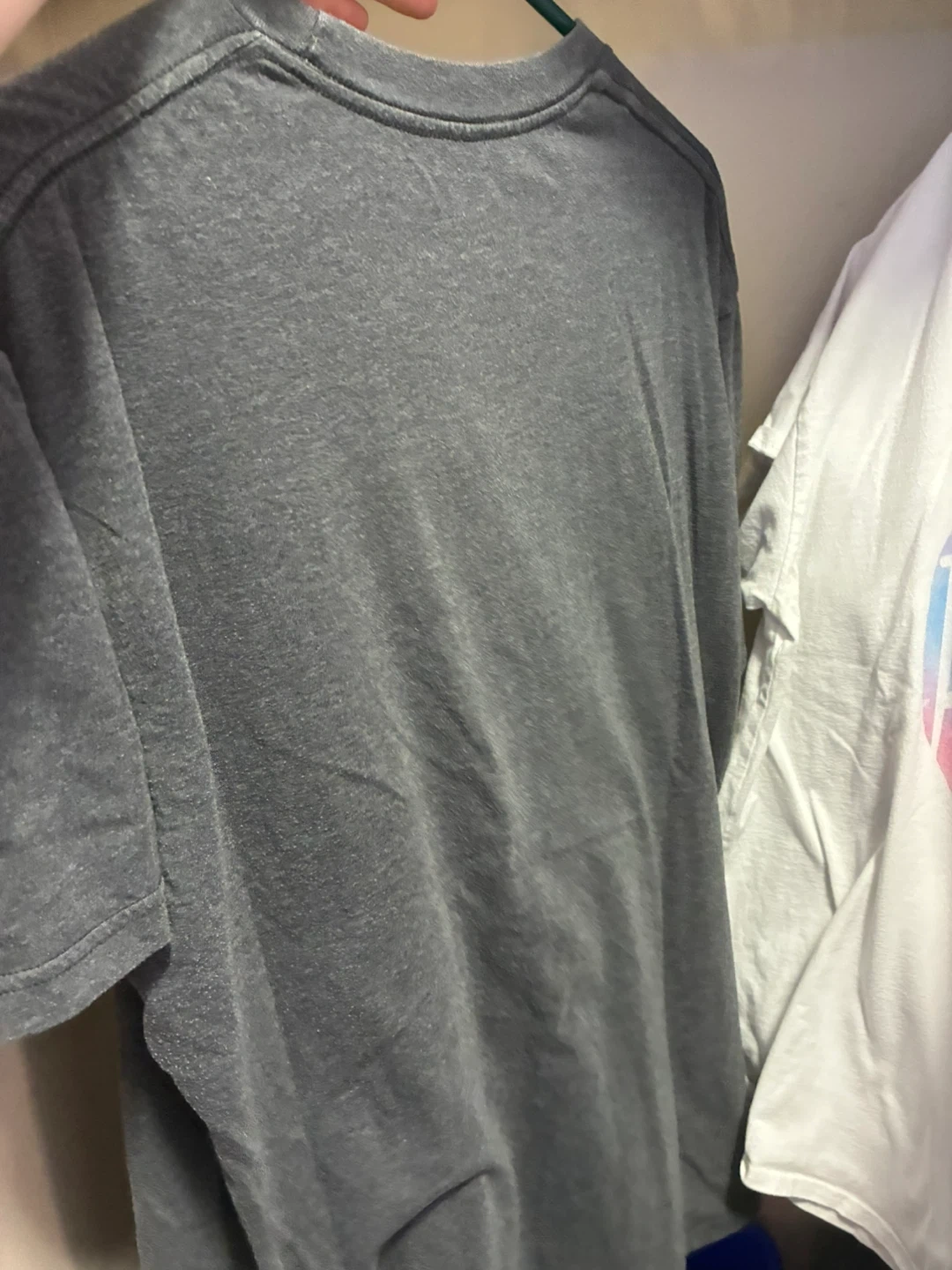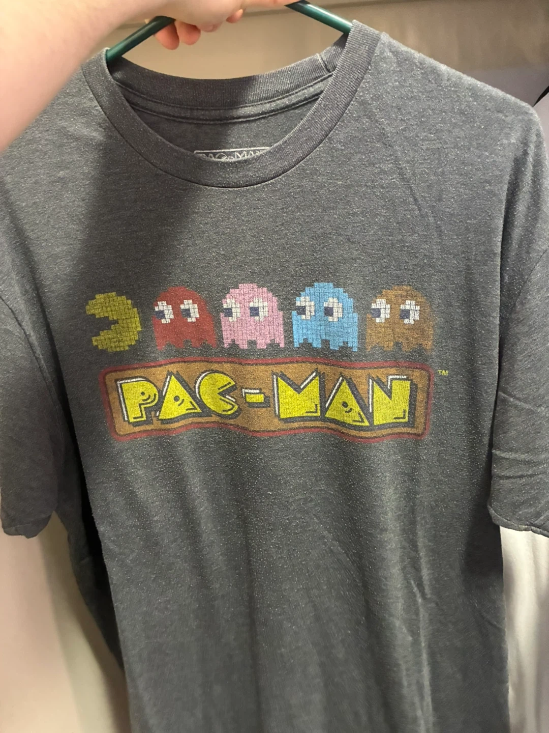Grey t-shirt with a Pac-Man ghost graphic on the front. Short sleeves and crew neck. Great for any Pac-Man fan!