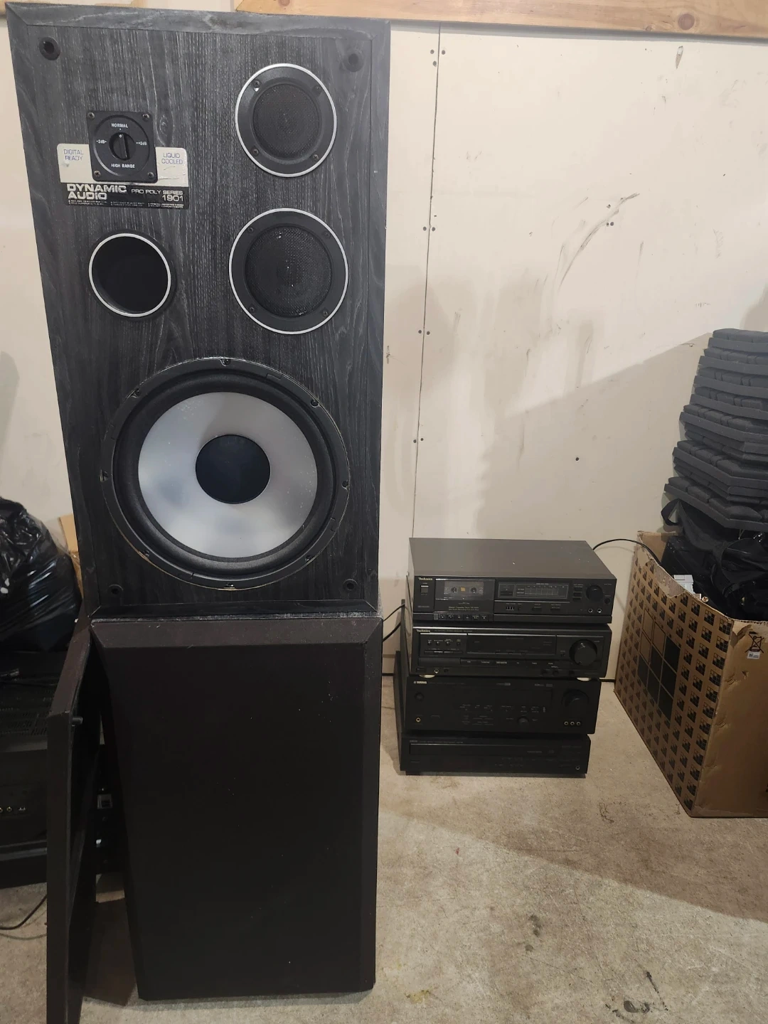 A Dynamic Audio 1801 Pro Poly Series speaker with a large woofer and multiple smaller drivers. It features a wood grain finish on the front panel and a black fabric grille. Liquid cooled for extended use. SPEAKERS ONLY π π!!!!!!!!!!!!! NO STEREO WITH SPEAKERS.......