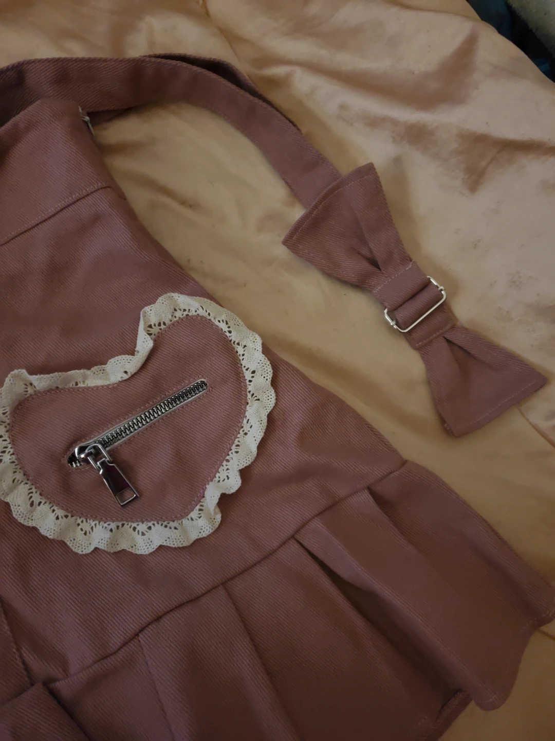 Cute pink bow suspender skirt. Straps detachable with a bow on the shoulders. Has two tiny zip pockets at the front. New, with tag. Only tried on. Waist approx 66 cm, best suited for a size xs. Does not have built in shorts but has an underlining.