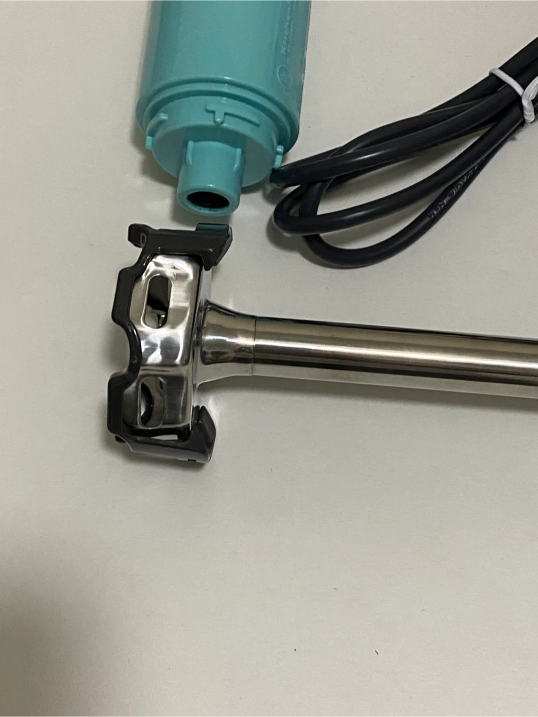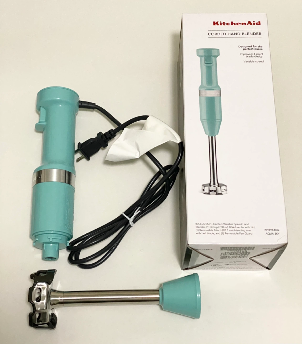 It's a KitchenAid corded variable speed hand blender in Aqua Sky. Includes a 20.3 cm removable blending arm with bell blade. Perfect for blending soups, smoothies, and sauces.