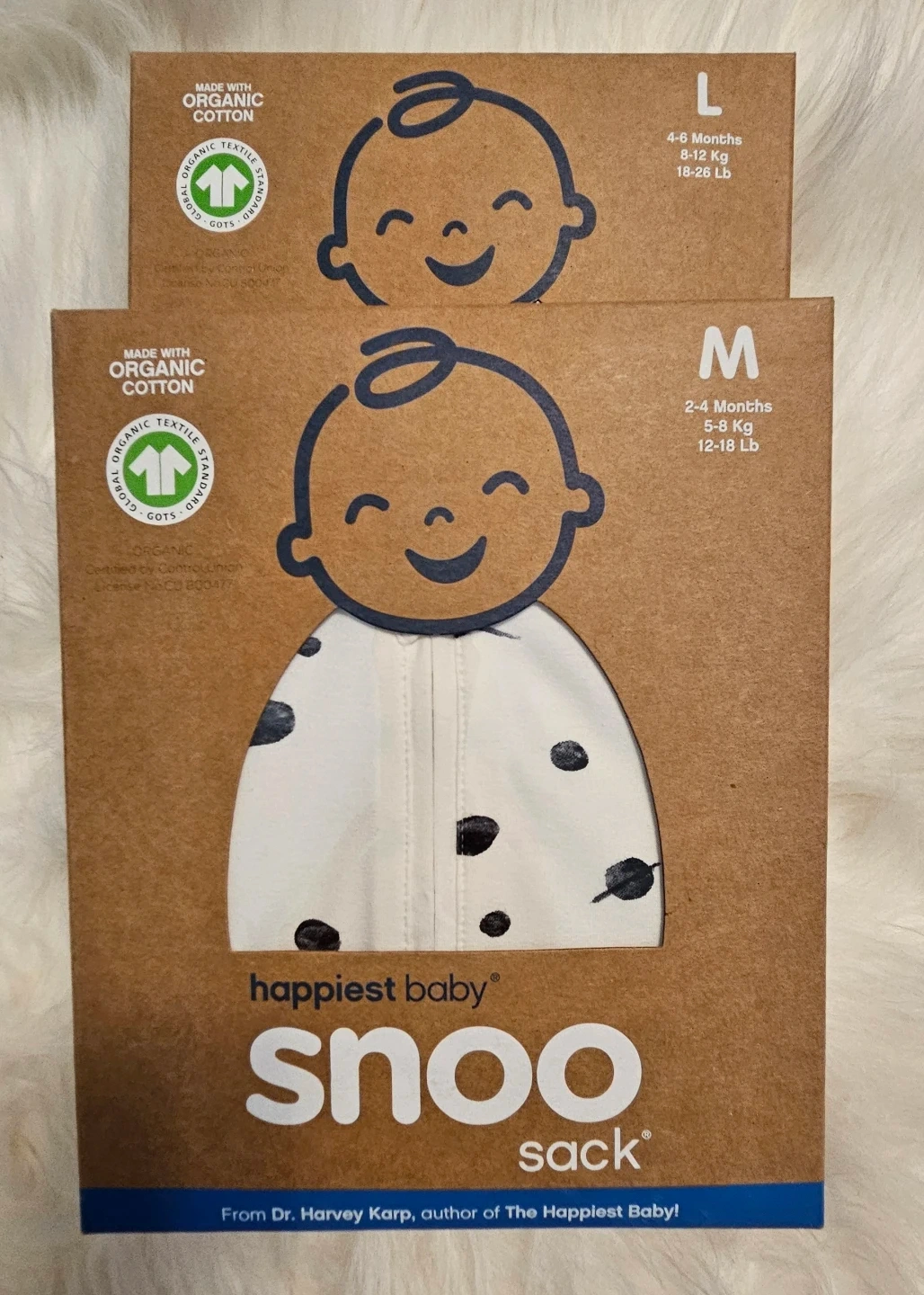 131Selling a Happiest Baby Snoo Sack in size M & L perfect for babies aged 2-4 months (5-8 kg or 12-18 lb) & 4-6 months (8-12 kg or 18-26 lb). It's made with organic cotton, so it's gentle on your little one's skin