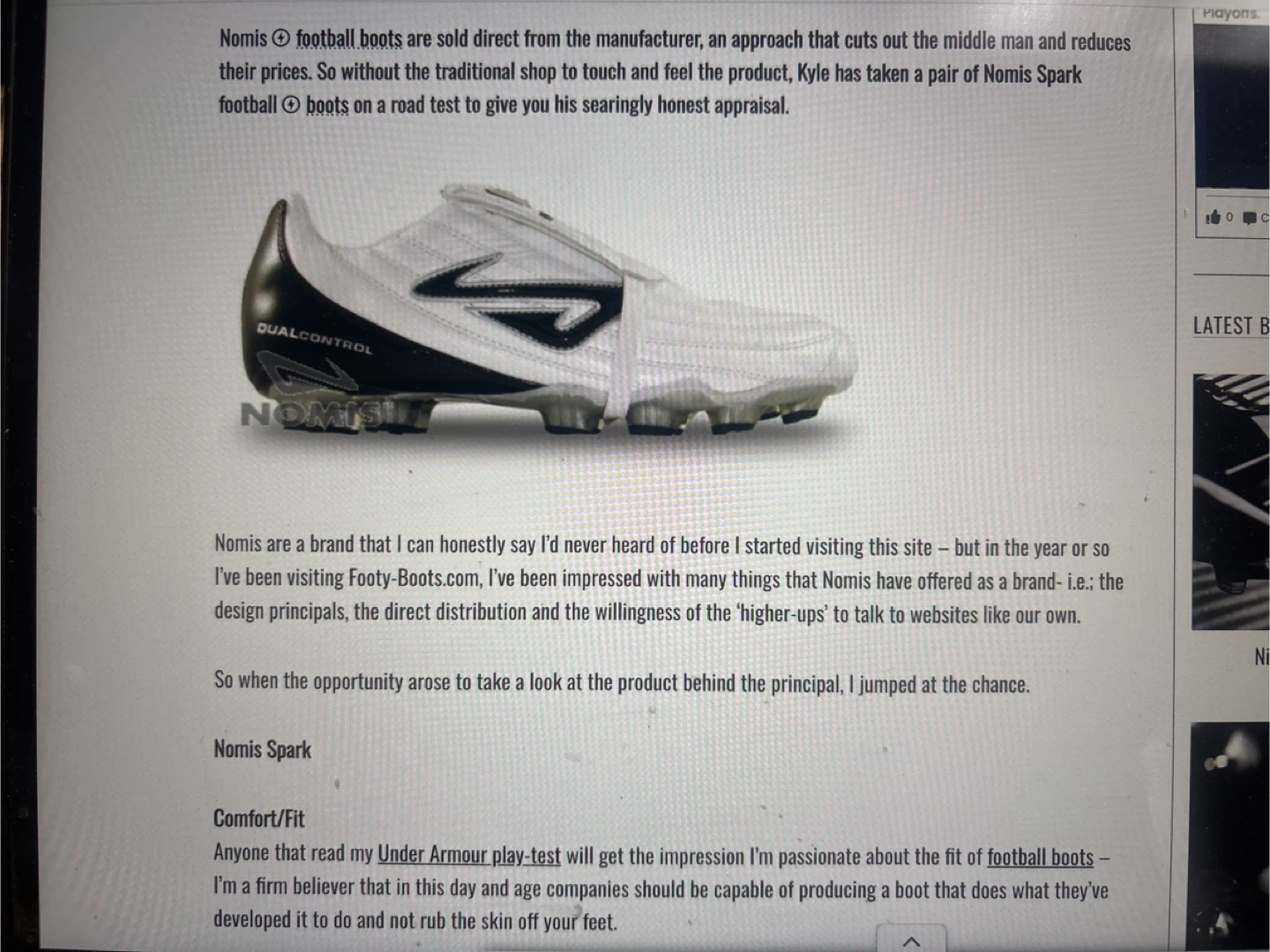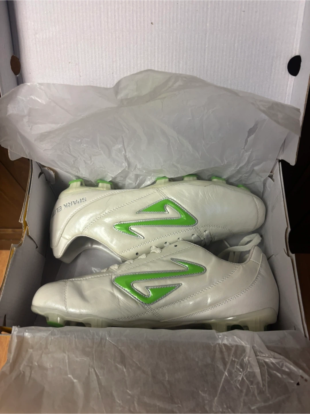 60Selling a pair of Nomis Spark Elite FG soccer cleats in men's size 10.5! These cleats are white and green and come with the original box. The upper is made of kangaroo leather, and the outsole is TPU firm ground. They're in great shape and ready for the field, be it Soccer Rugby or Football