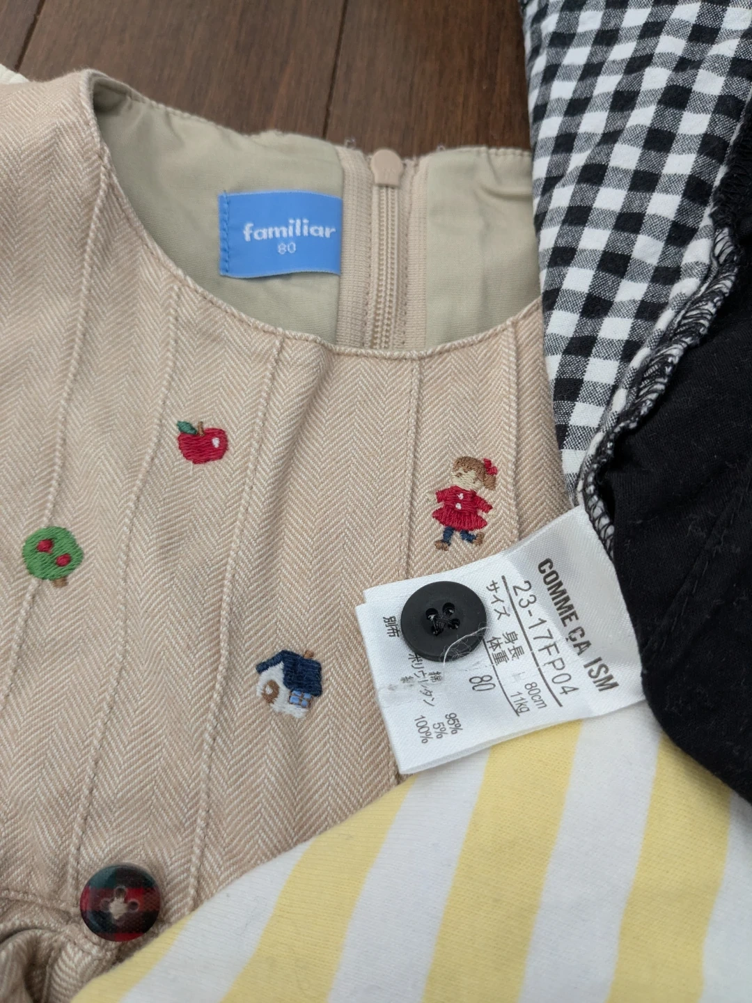 This is a bundle of baby and toddler clothes. It includes items from ZARA, Familiar, and Comme ca ism. Mostly sizes 80cm and 9-12 months. All items are in good condition.