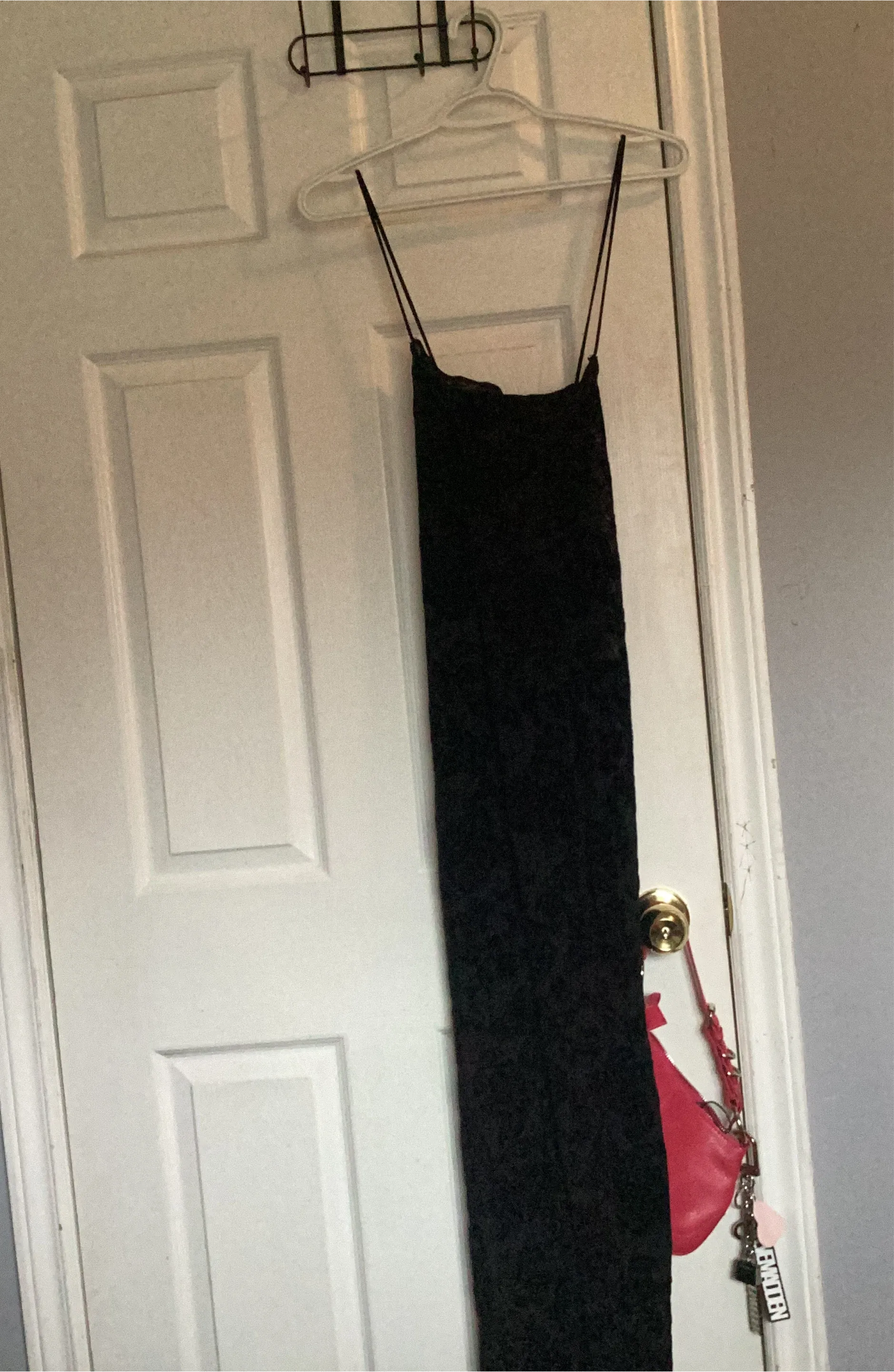 This is a long black lace dress with delicate spaghetti straps. It's perfect for a night out or a special occasion! The lace fabric gives it a sophisticated look.