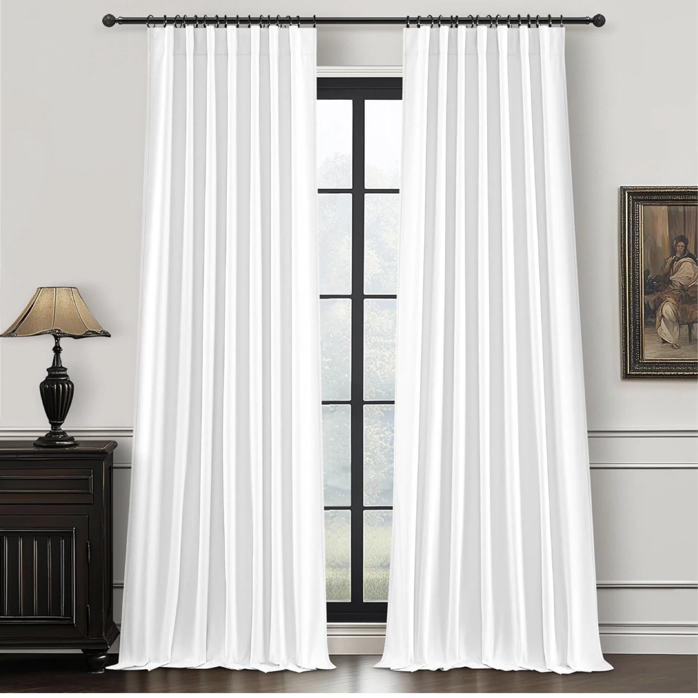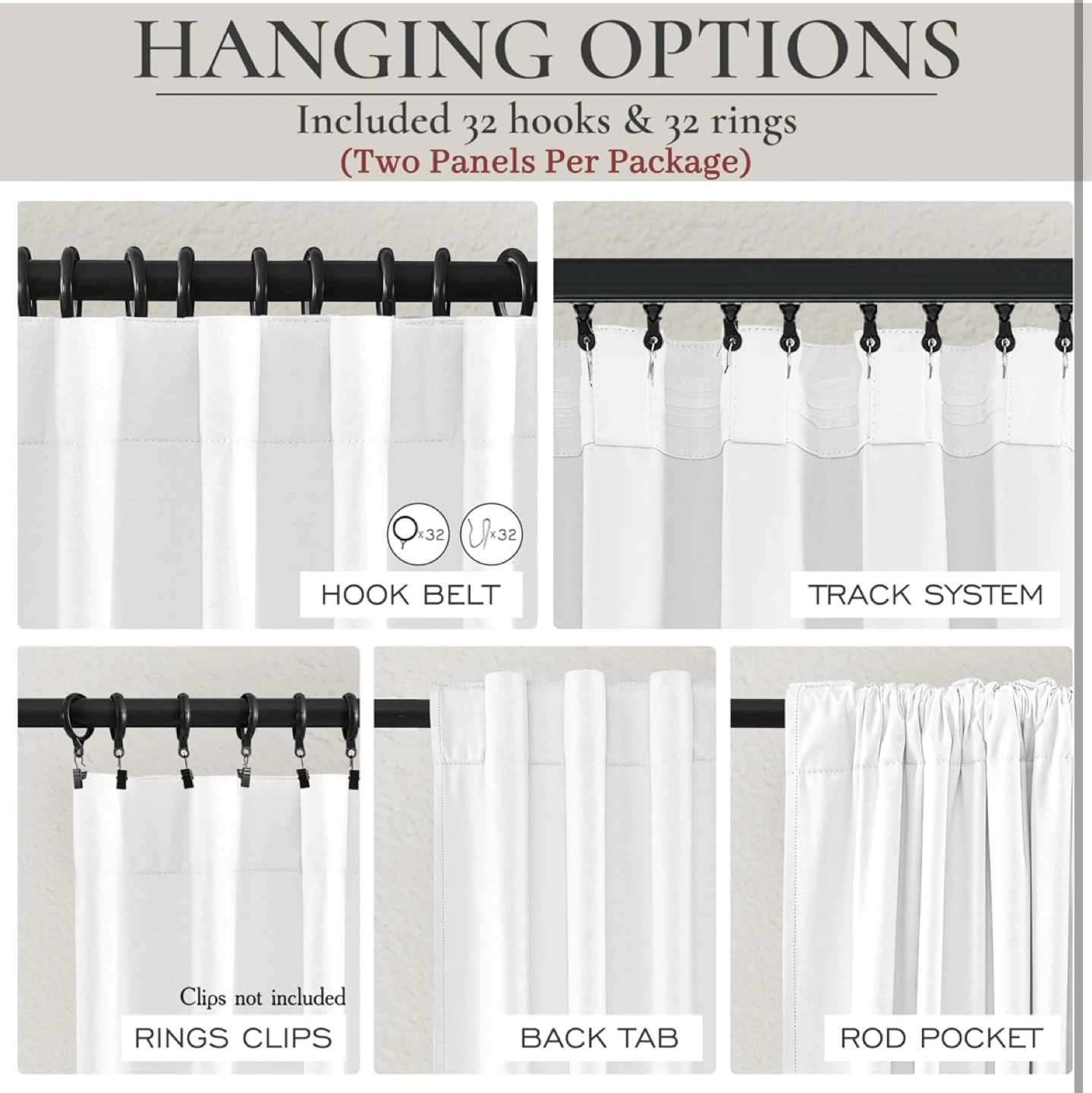 These heavy-duty curtains are crafted from a 350gsm linen blend fabric for excellent light blocking. They feature a 4-layer construction with double high-density blackout yarn. Included are 32 hooks and 32 rings for easy hanging with various options like a hook belt, track system, or rod pocket.