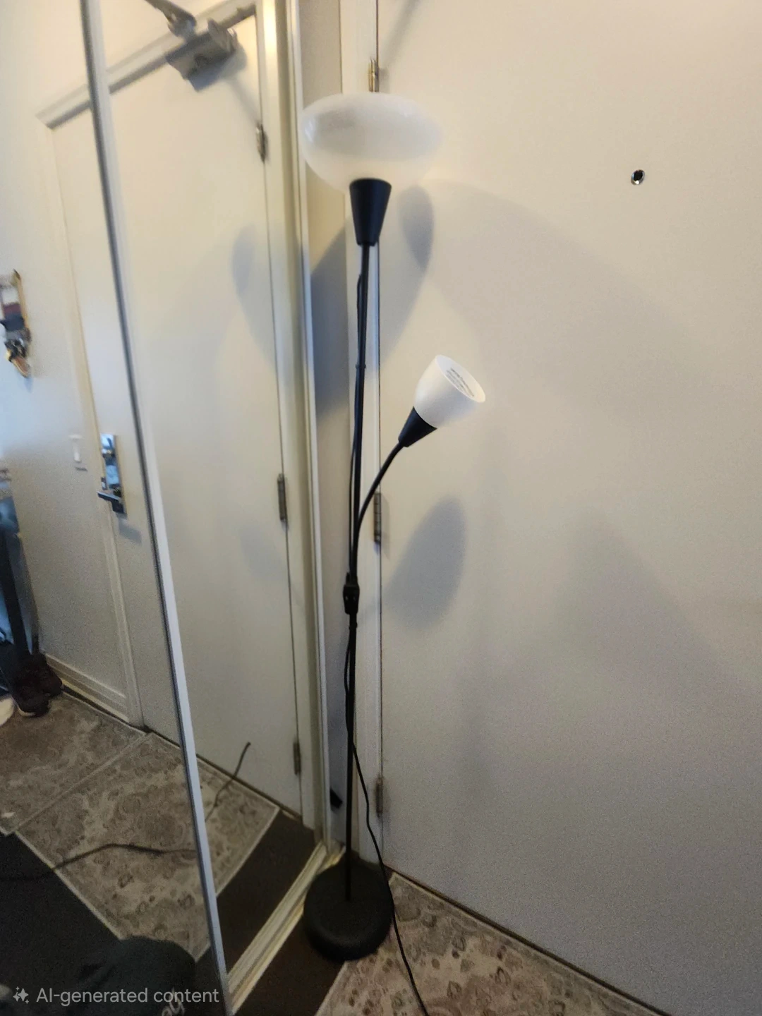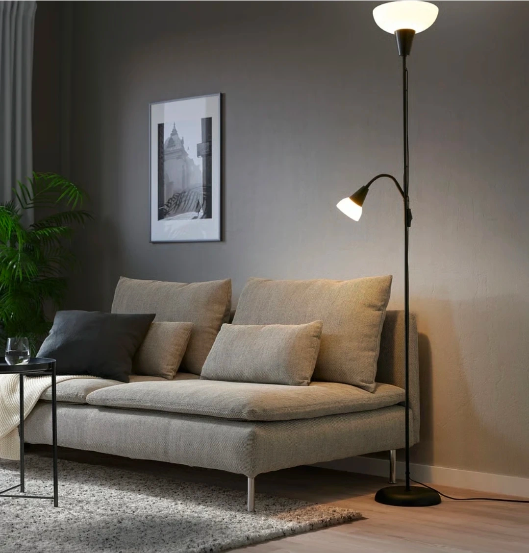 Here's a floor lamp with two lights! It has a black base and pole, with one larger white light at the top and a smaller adjustable light on the side. It's perfect for adding some extra light to any room