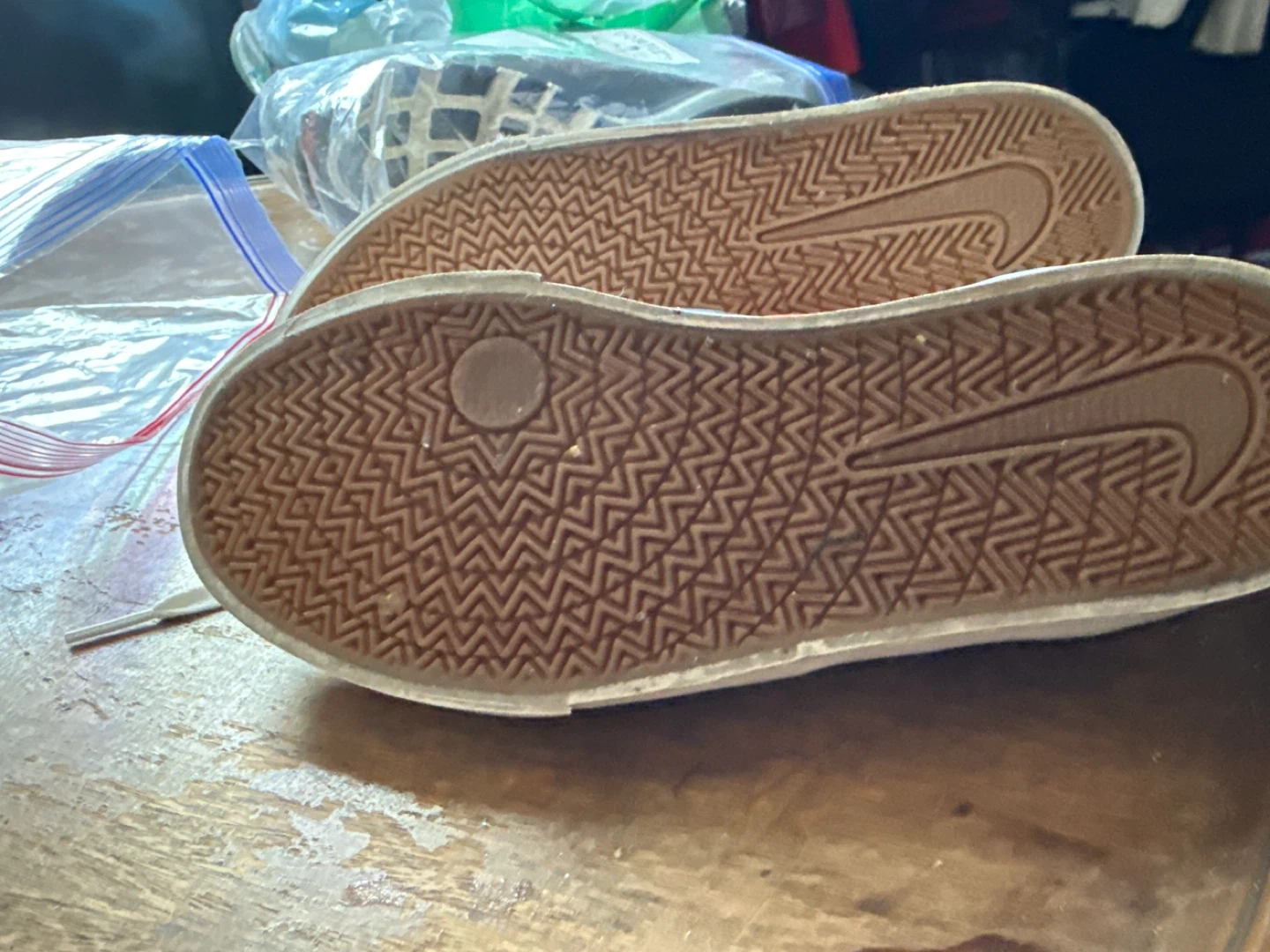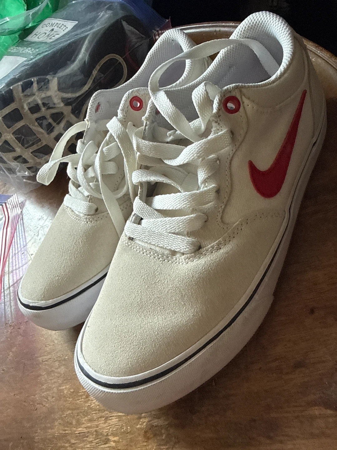 Nike SB skate shoes in off-white canvas with red accents. Features a durable rubber sole. US size 5, UK 4.5, EUR 37.5, CM 23.5.