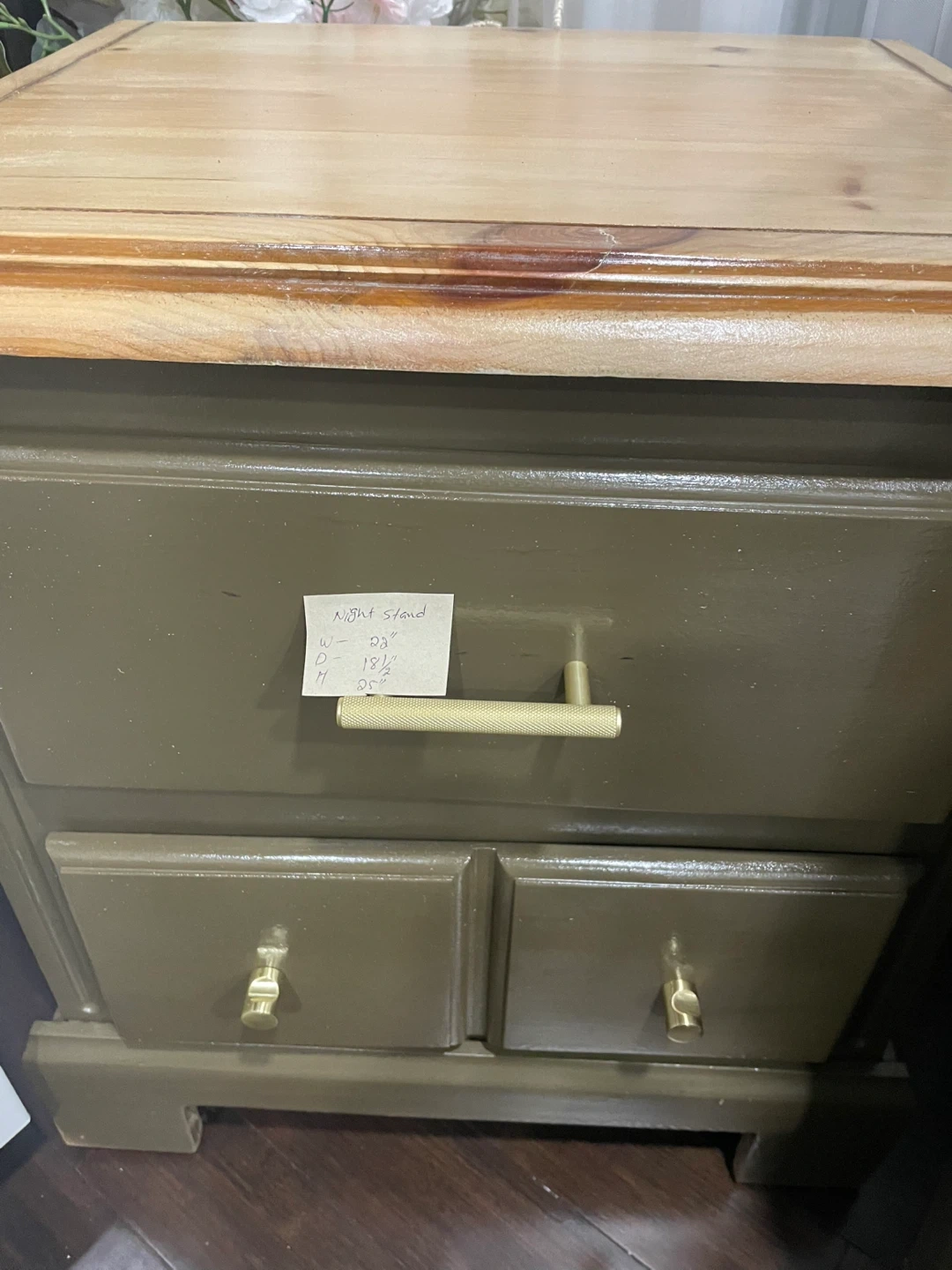 Here's a cute night stand that would look great in any bedroom! It features two drawers and has a wooden top. The dimensions are: - Width: 23 inches - Depth: 18.5 inches - Height: 27 inches