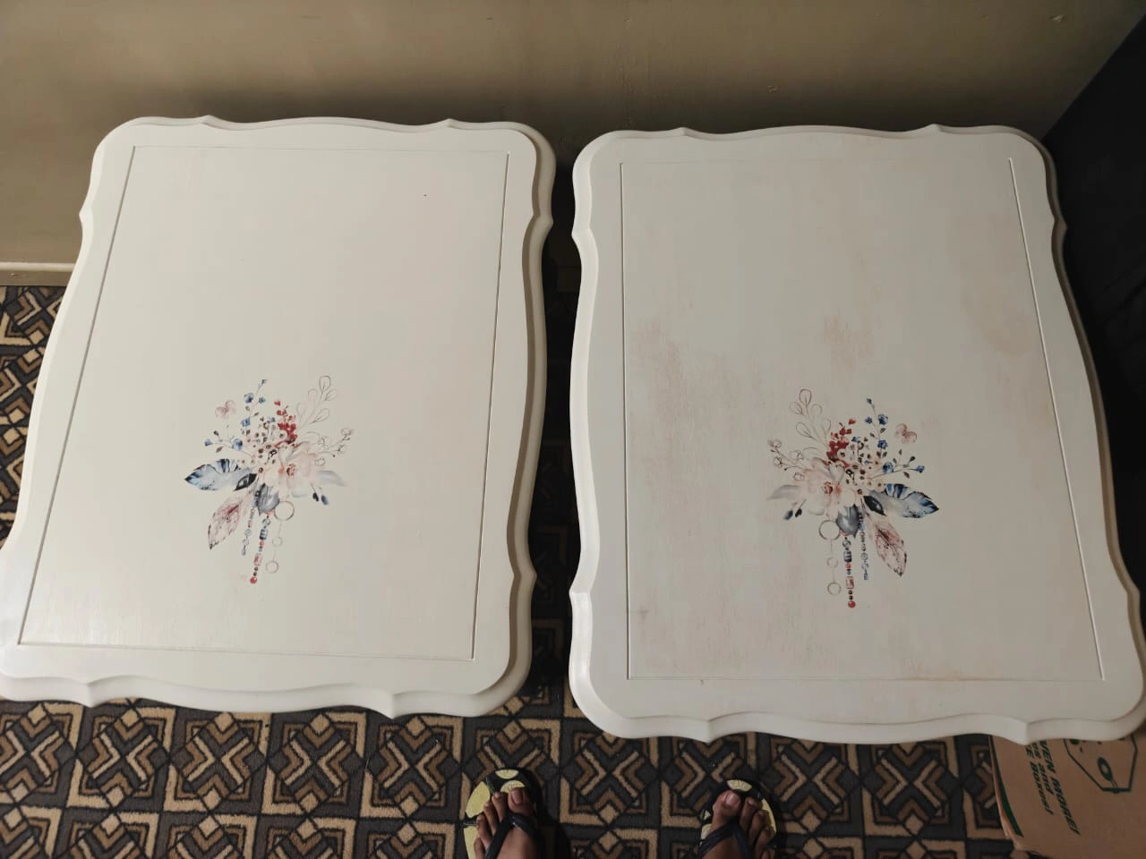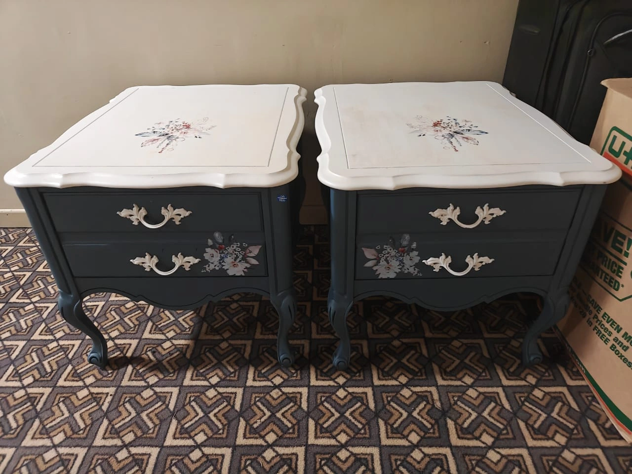 Selling a Brand new condition,used for a month or so been wrapped and open now strong sturdy and beautiful sets of two.Hand painted. Selling 80$ for 1 or 160$ for two. There is a coffee table as well with same patten & color 100$.