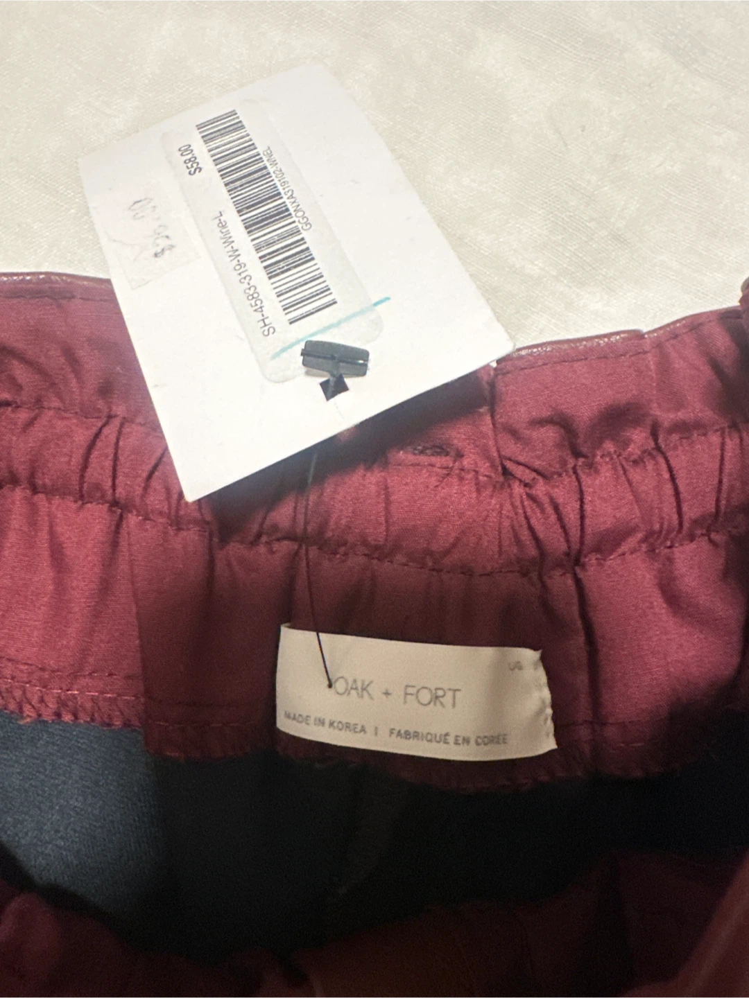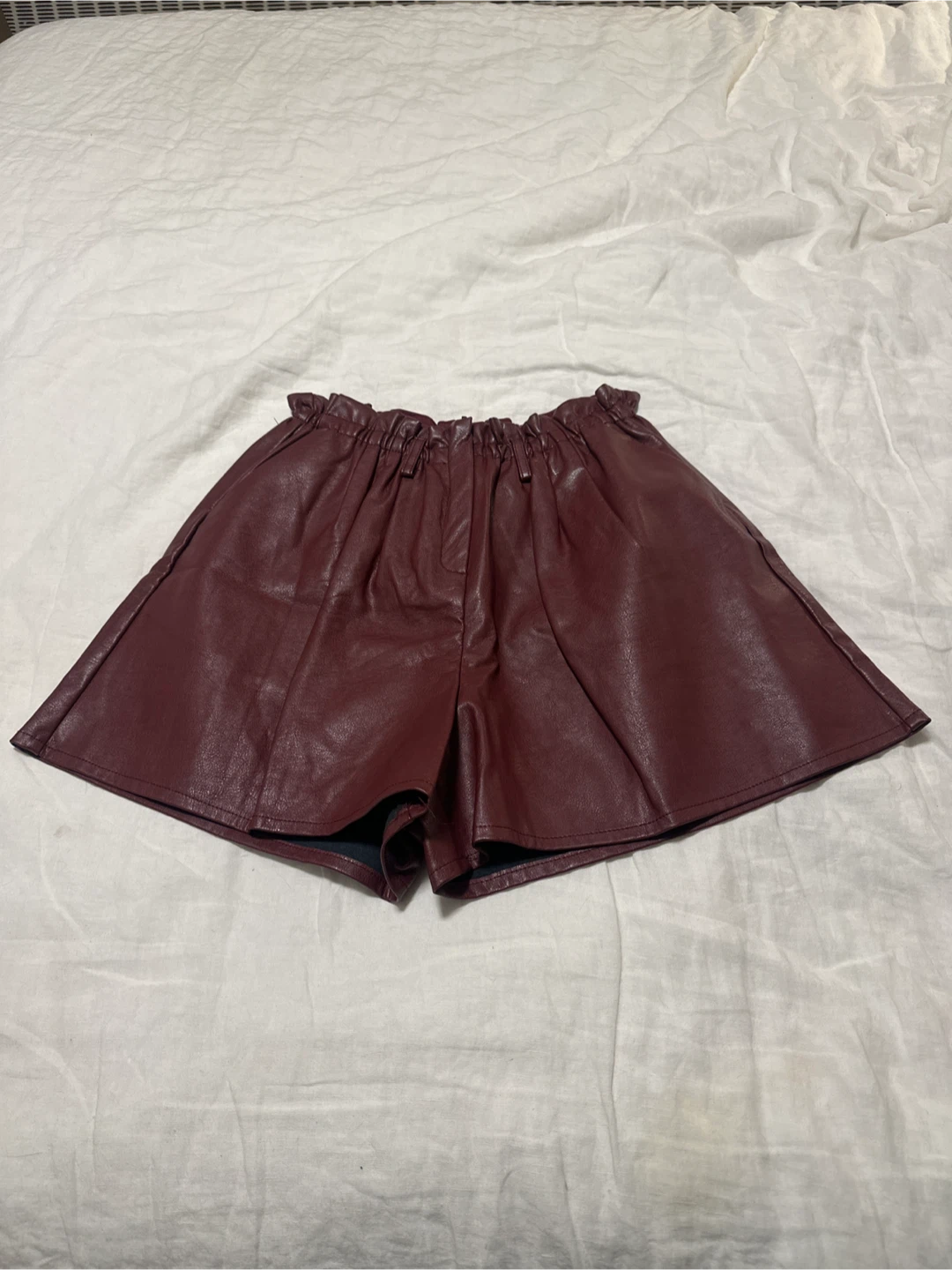 Selling a pair of Oak + Fort vegan leather shorts in a rich burgundy colour. They're size Large still with tag