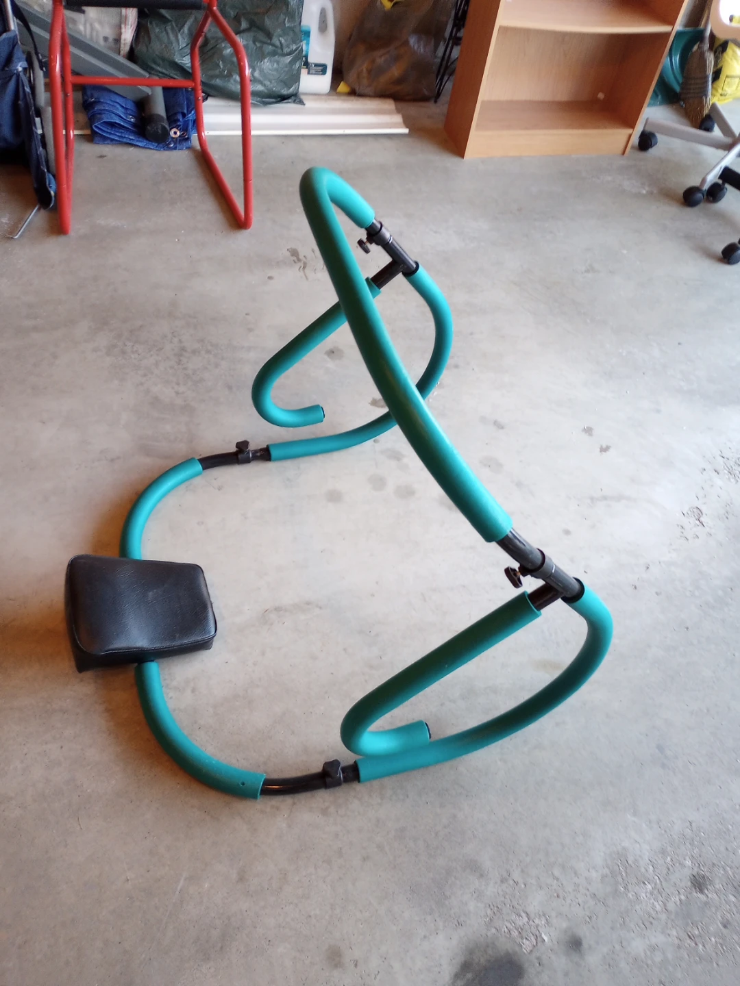 This is an ab roller wheel exercise machine designed for core workouts. It features a padded headrest and sturdy construction. This equipment is great for targeting abdominal muscles.