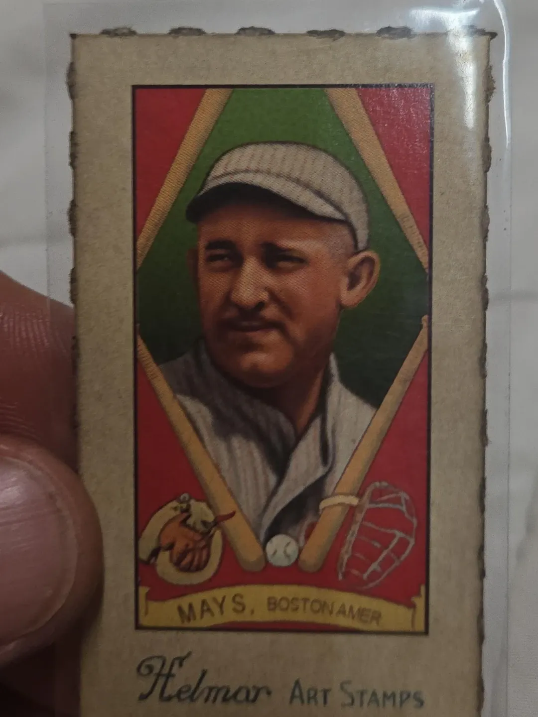 This is a Helmar Art Stamps baseball card featuring Mays of the Boston Amer. It's part of an art stamp series. The card shows a portrait of Mays with baseball bats, a mitt, and a ball.